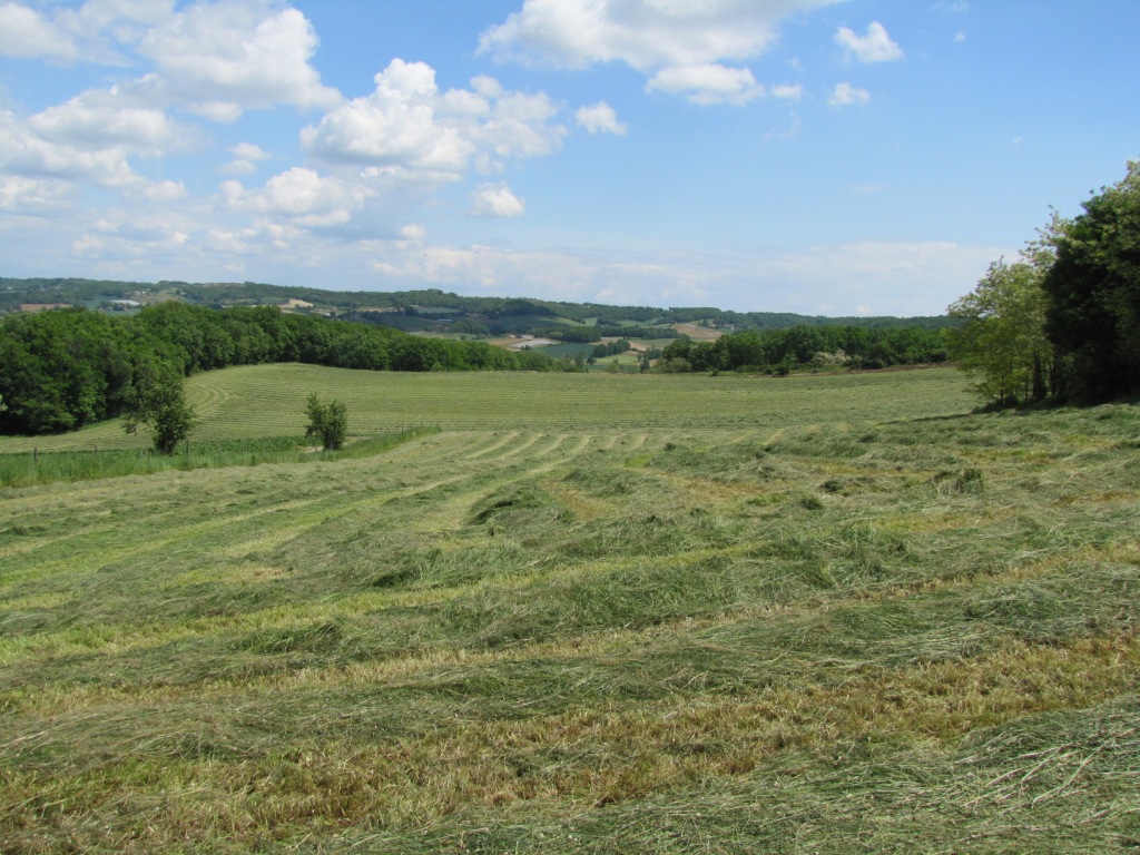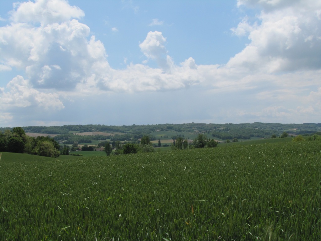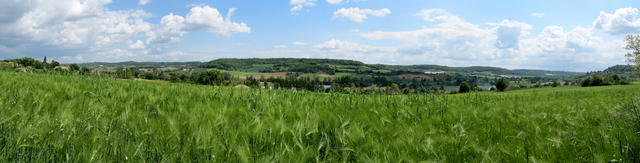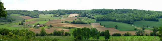 Breitbildfoto kurz vor Lauzerte. Wiesen, Felder und Wälder, soweit das Auge reicht