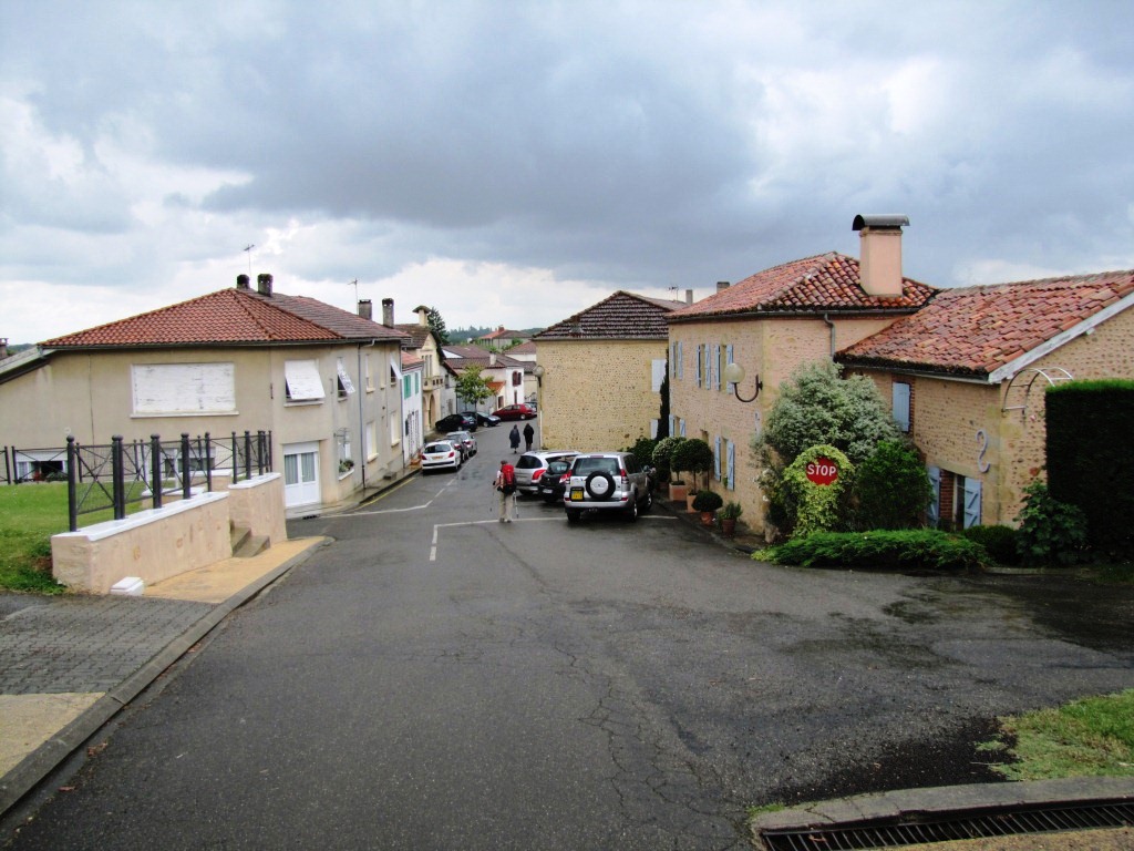 wir haben die Kirche verlassen und laufen bei Nieselregen in Miramont-Sensacq ein