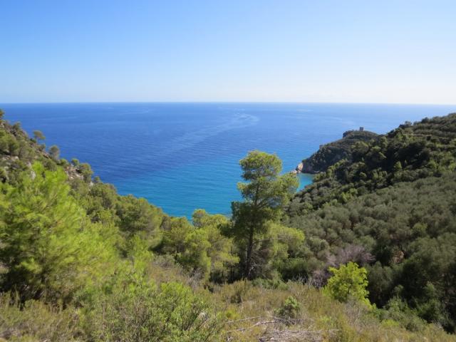 Varigotti dahinter Punte Crena. Dort werden wir die Küste verlassen und in die hügelige Landschaft eintauchen