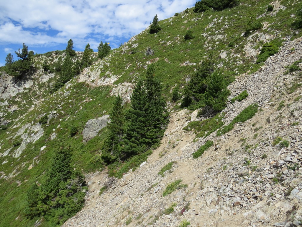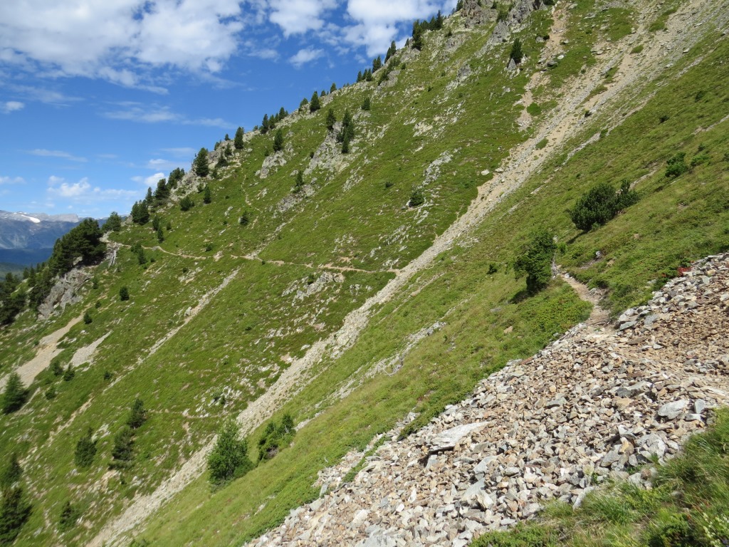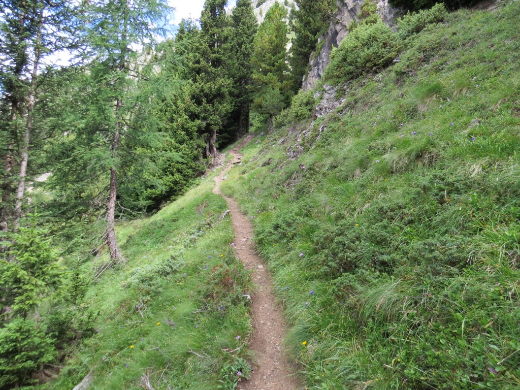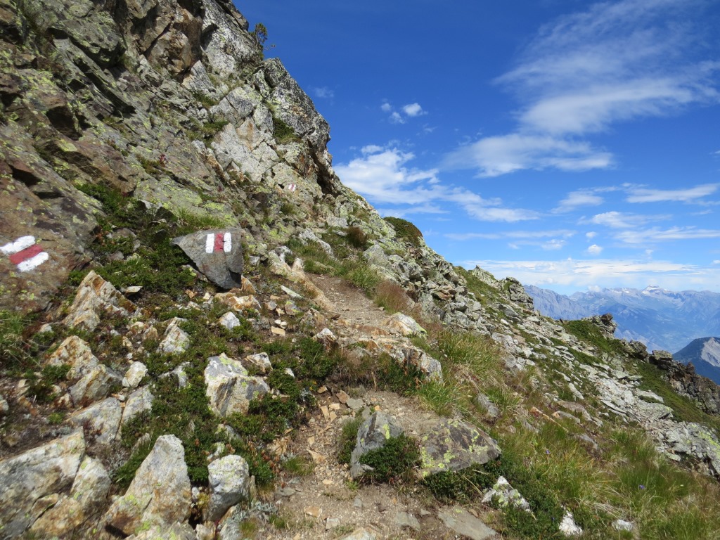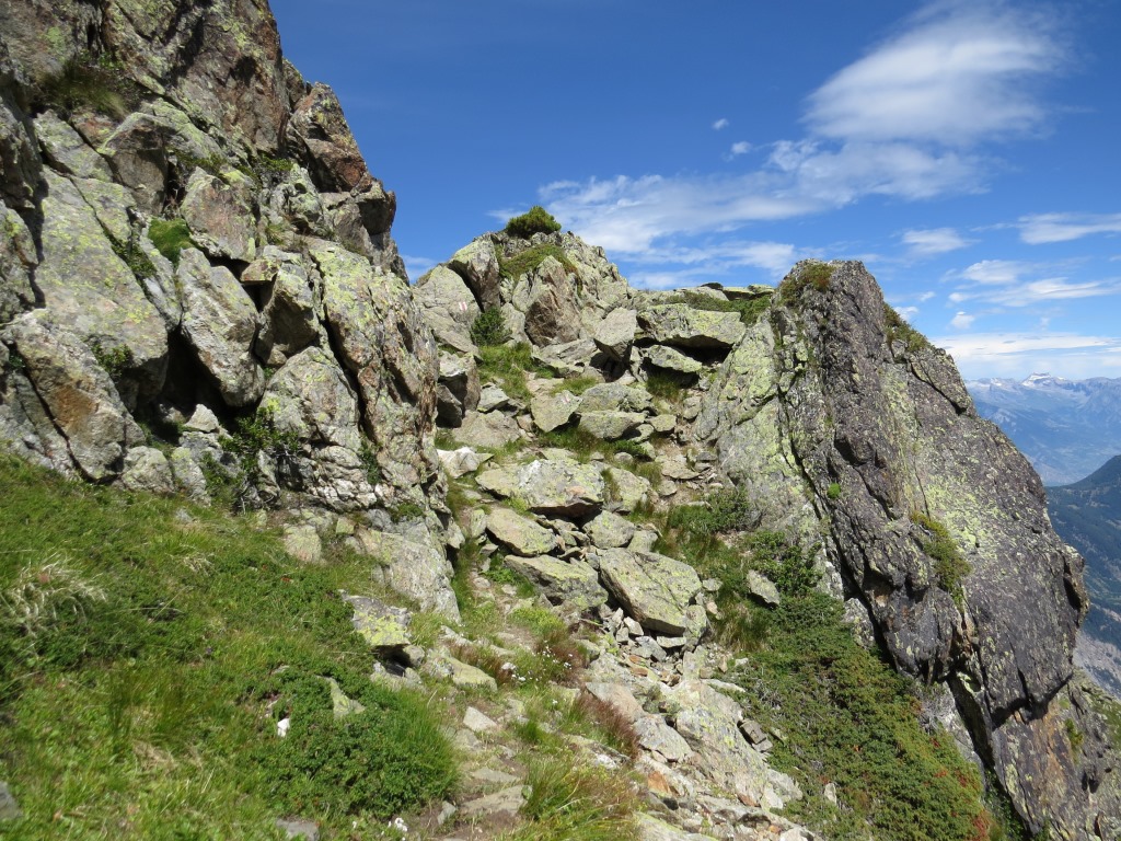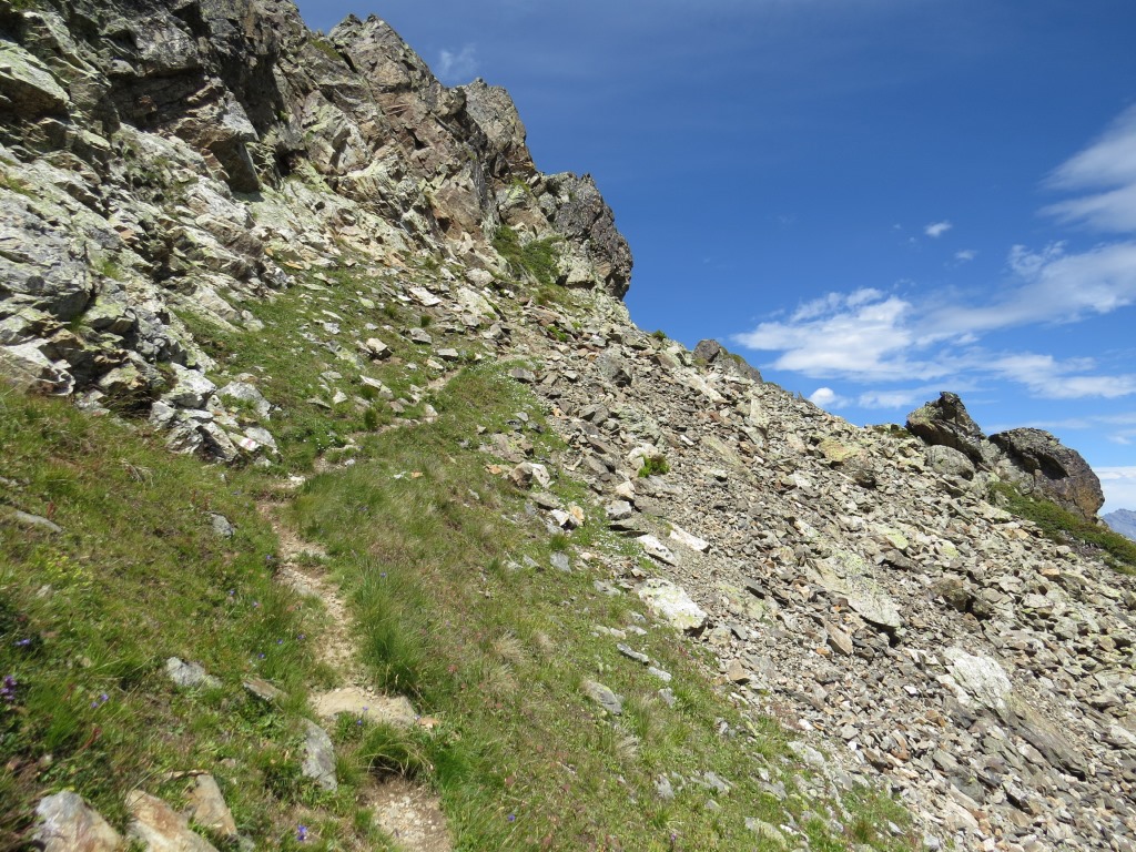 der Bergpfad durchquert nun die schrofige und steile Westflanke der Pointe des Chevrette