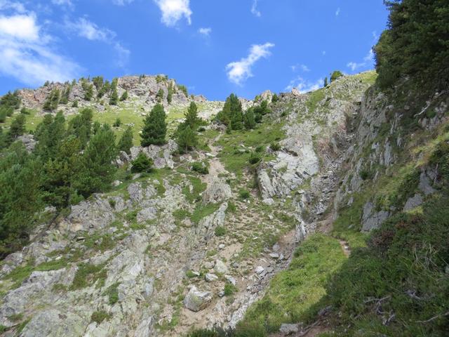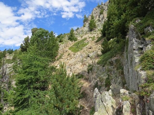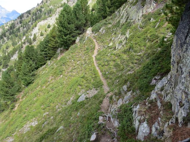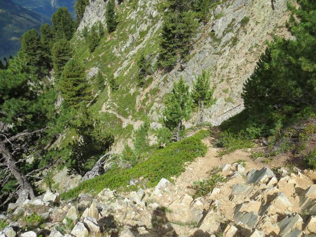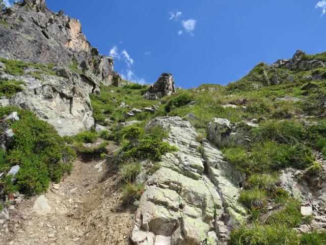 der Bergpfad verlangt nun bei 2-3 Stellen sogar etwas Handanlegen. Steil schiessen die Bergflanken in die Tiefe