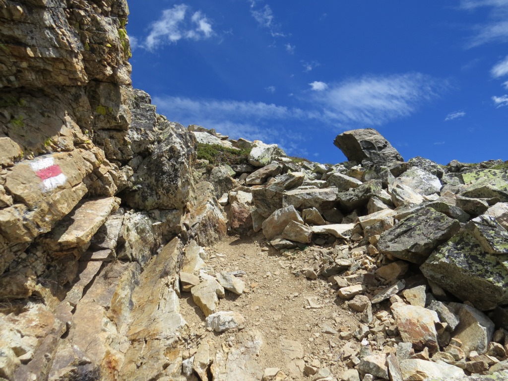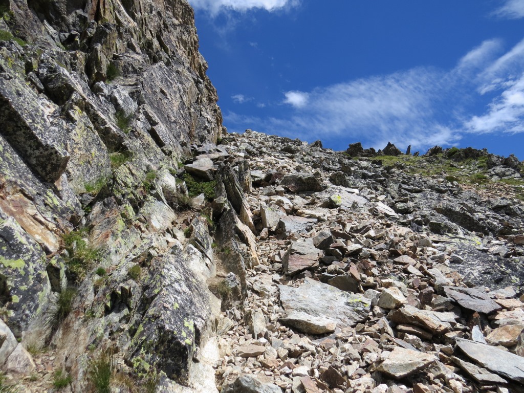 ...und wandern über grobem Blockschutt durch eine kleine Scharte