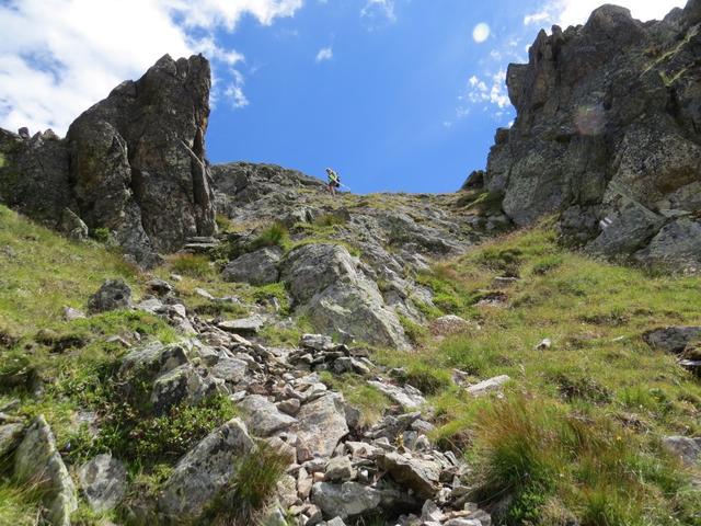auf dem Grat angekommen, biegen wir links durch einen schmalen Felsdurchgang ab, und verlieren wieder leicht an Höhe