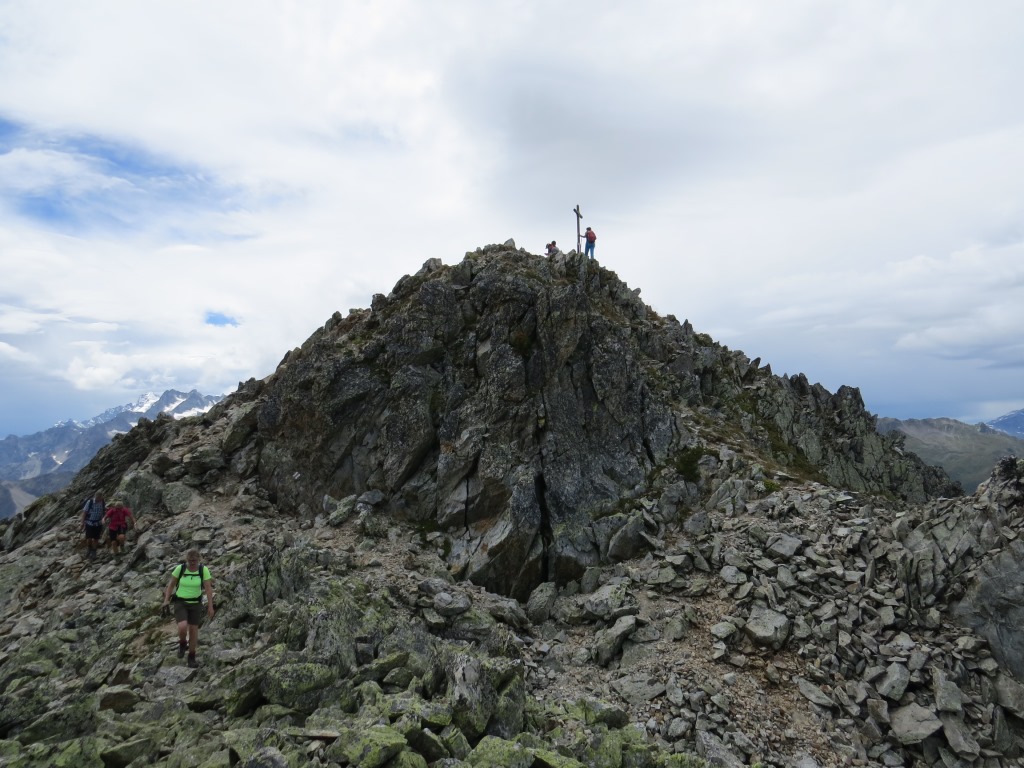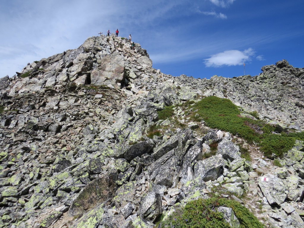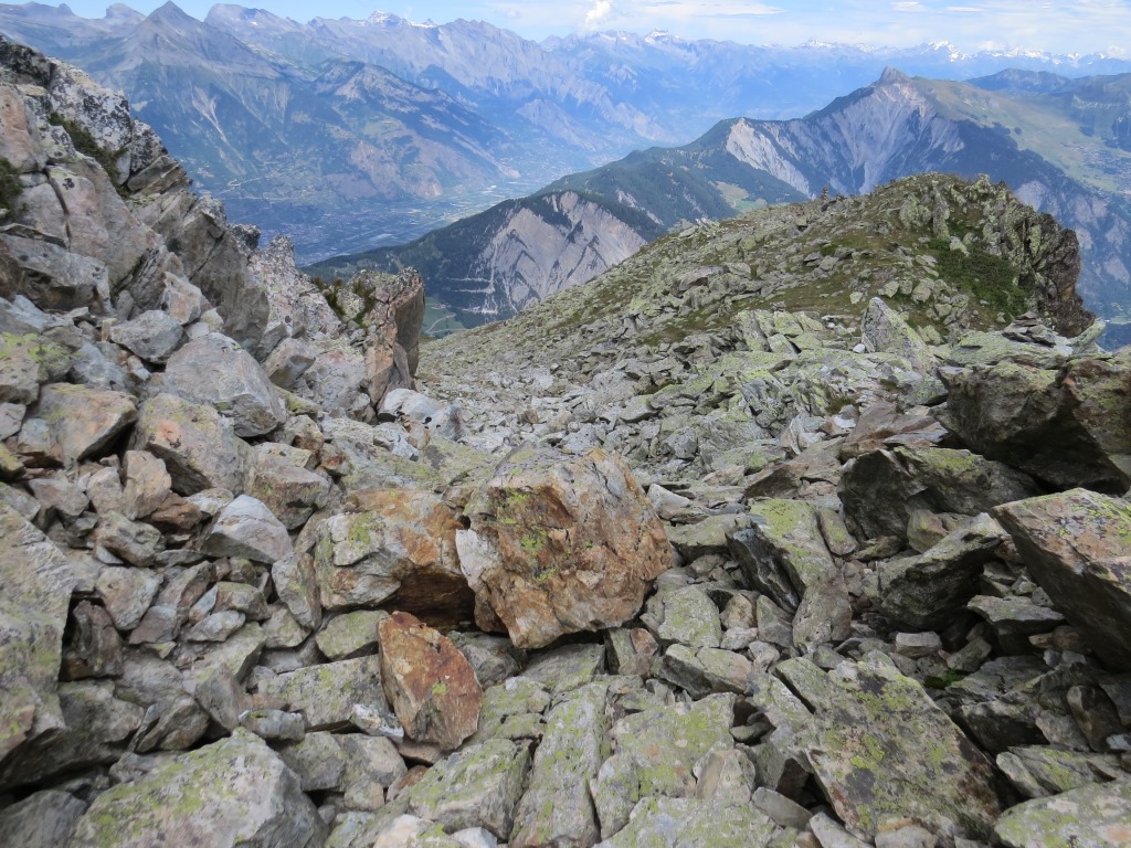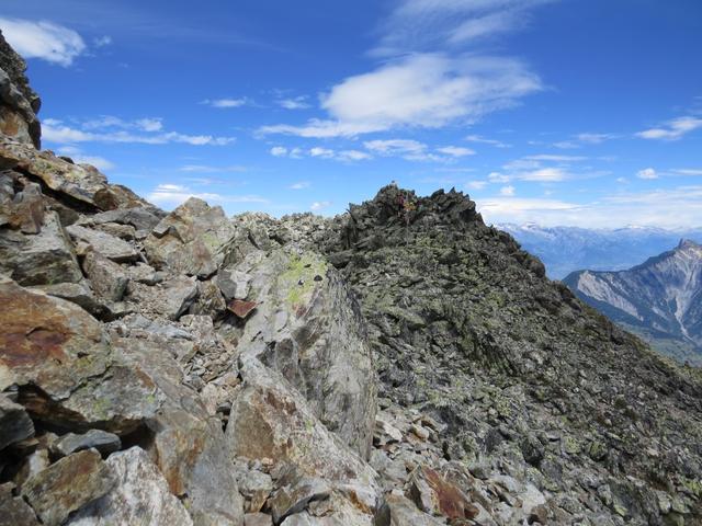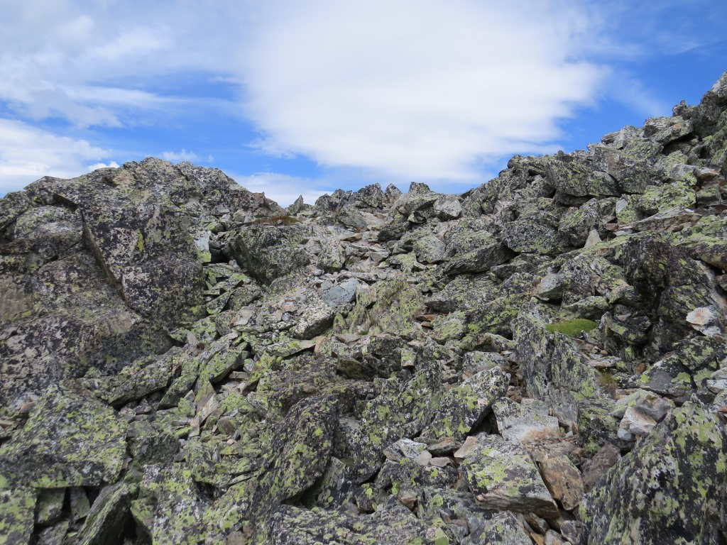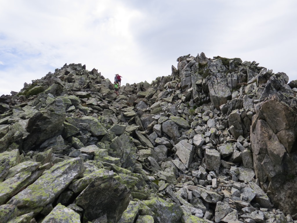 über Fels und Blockschutt geht es dem breiten Grat entlang...