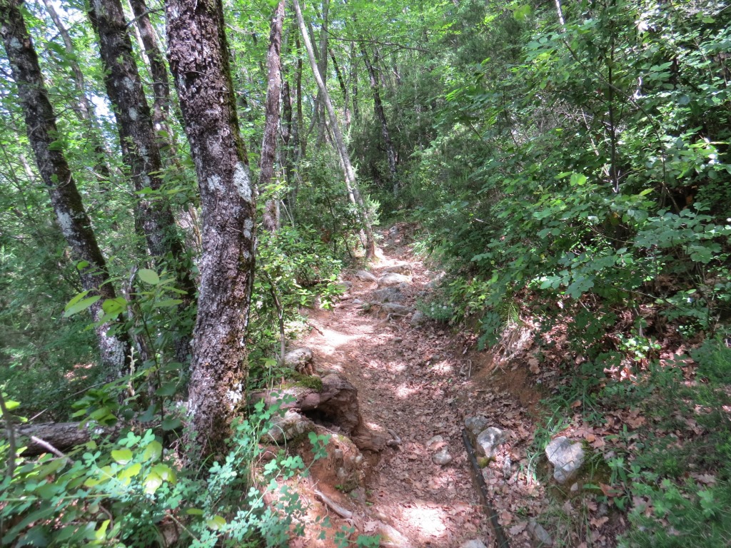auf einem stellenweise ausgewaschenen Weg mit viel Geröll, geht es nun steil abwärts