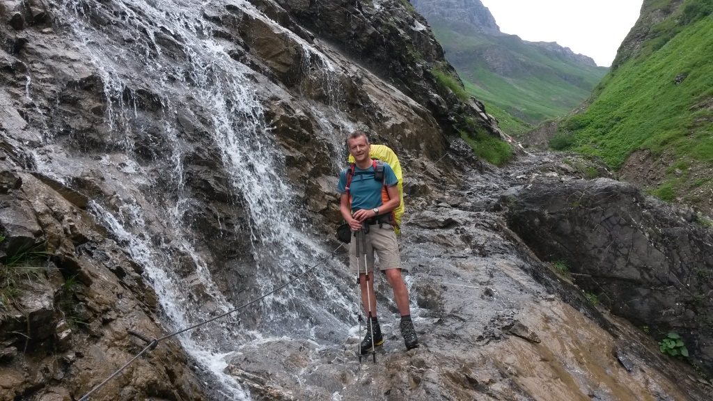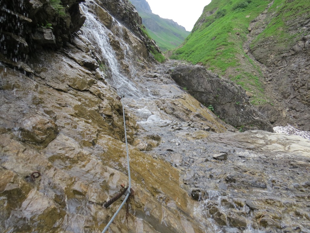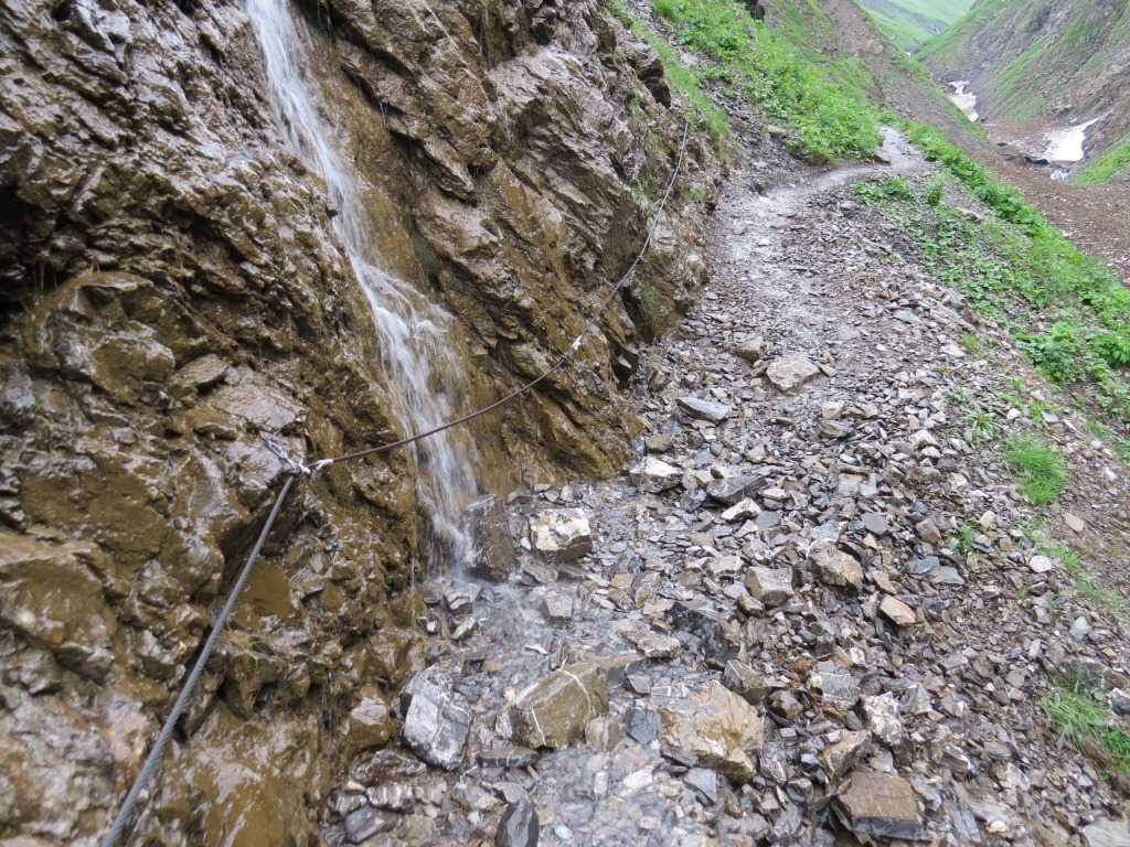 wegen dem bei Nässe rutschigen Weg, nehmen wir danken die Seilsicherung in die Hand