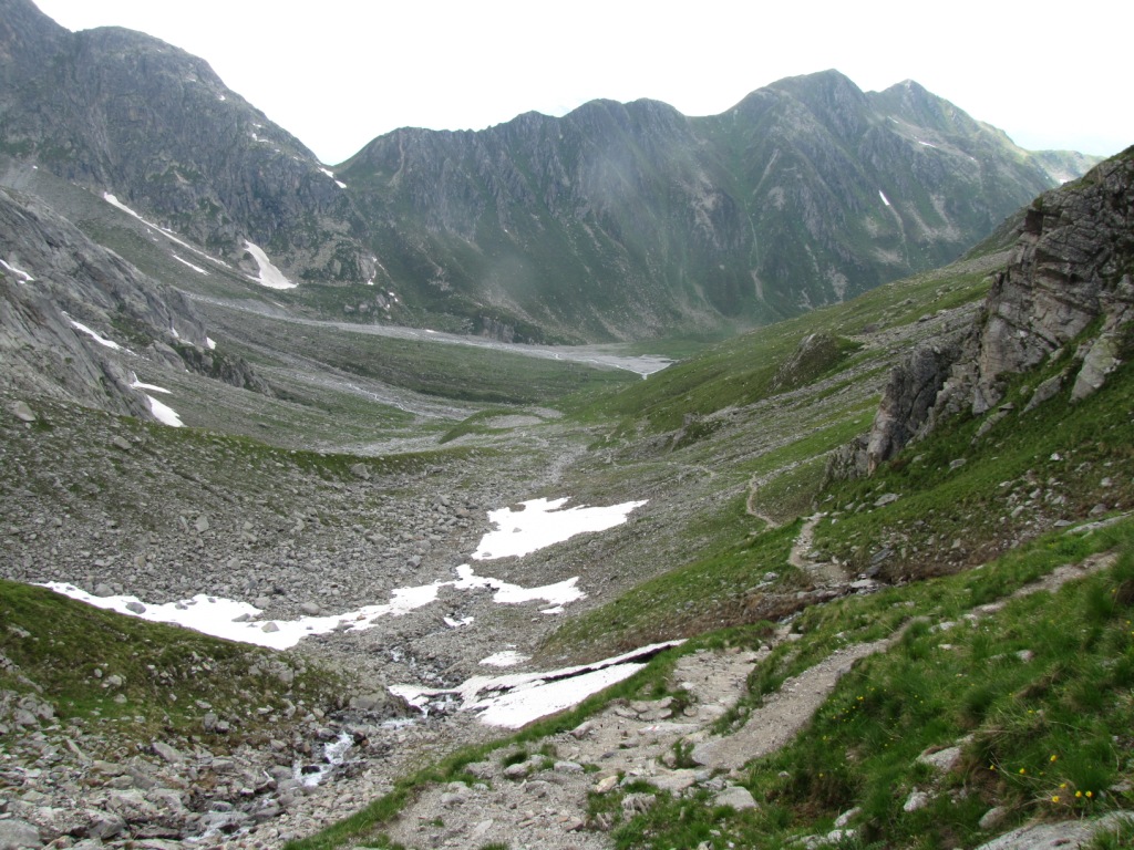 Blick zurück. In der Bildmitte schön zu sehen, der Übergang Fuorcla dalla Buora das einem nach Fourns bringt