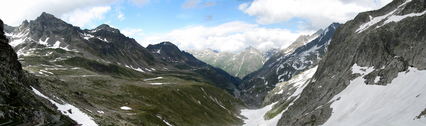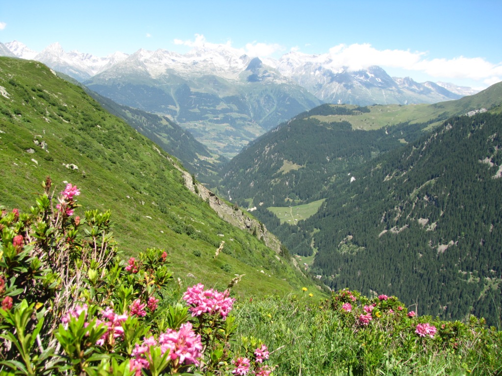 Breitbildfoto von der Camona da Medel ins Val Lavaz. Links gut ersichtlich der Hüttenweg