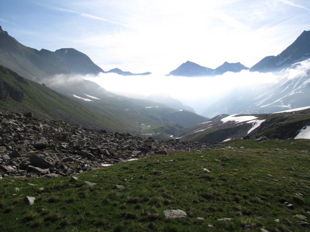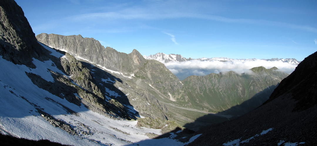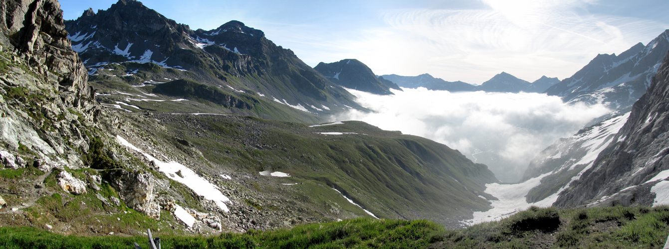 Breitbildfoto. Blick von der Camona da Medel Richtung Val Plattas. Der Nebel ist weg