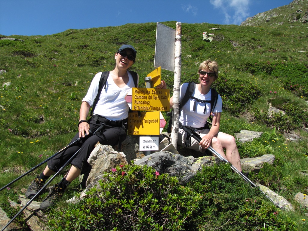 Franziska und Mäusi beim Wegweiser auf Alp Cuolmet 2100 m.ü.M.