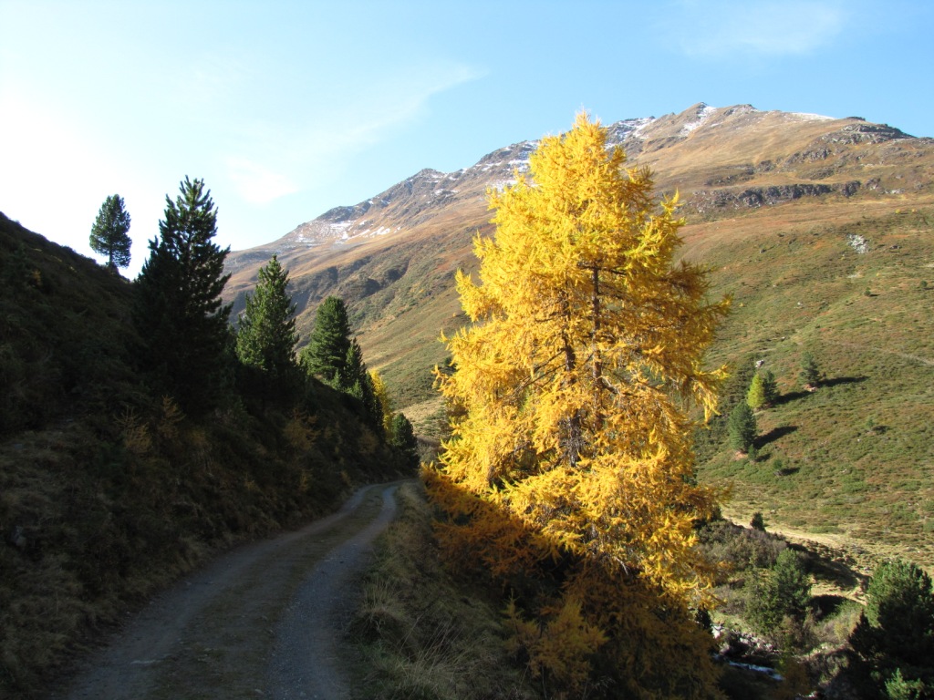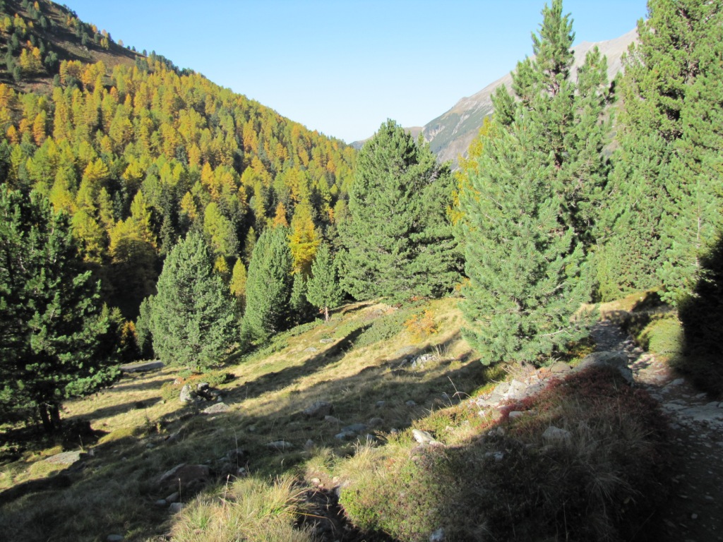 bei Punkt 2284 m.ü.M. geht es durch einen Föhren- und Lärchenwald abwärts