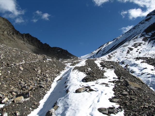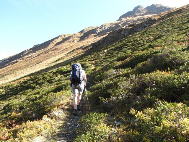 zuhinterst im Val Plazbi, führt der bis hier einfache Wanderweg, nun steil aufwärts