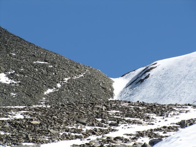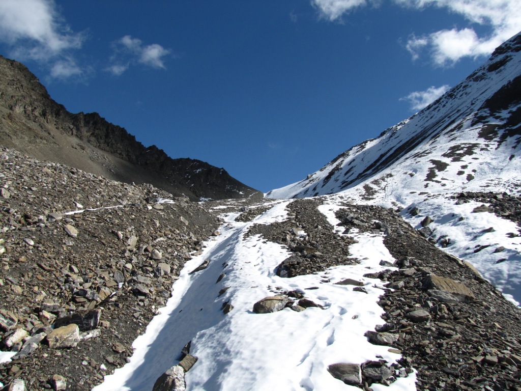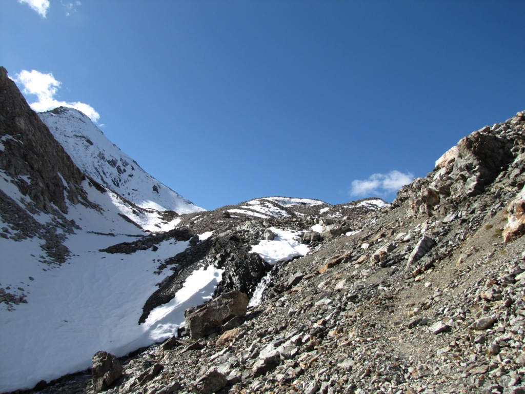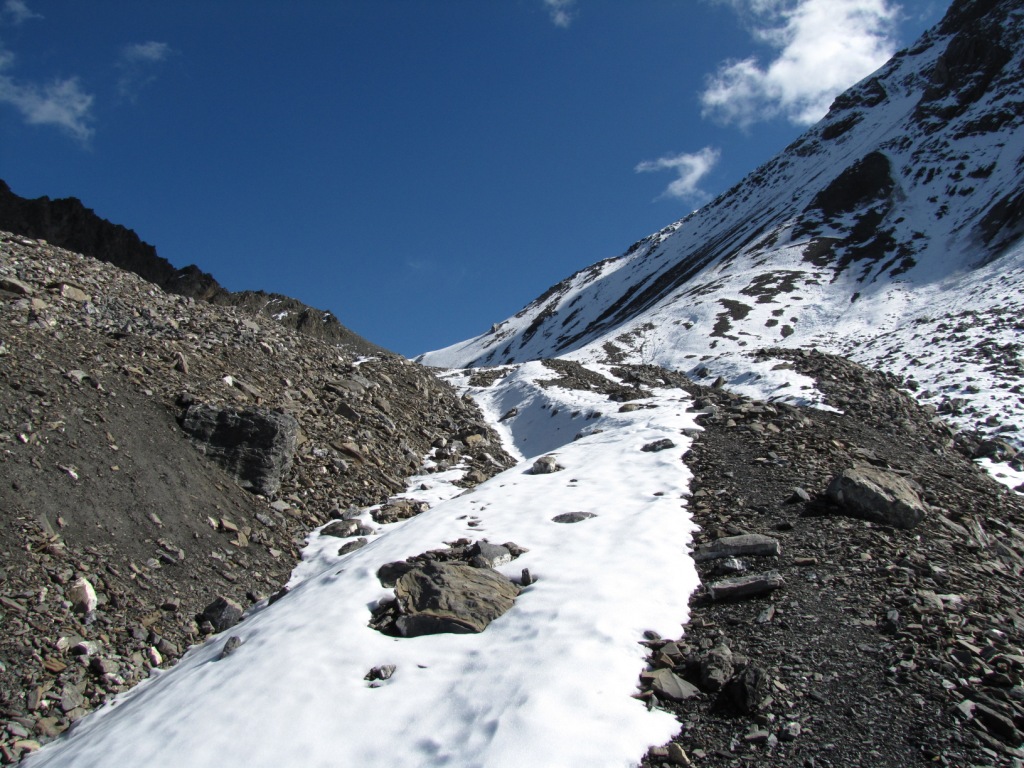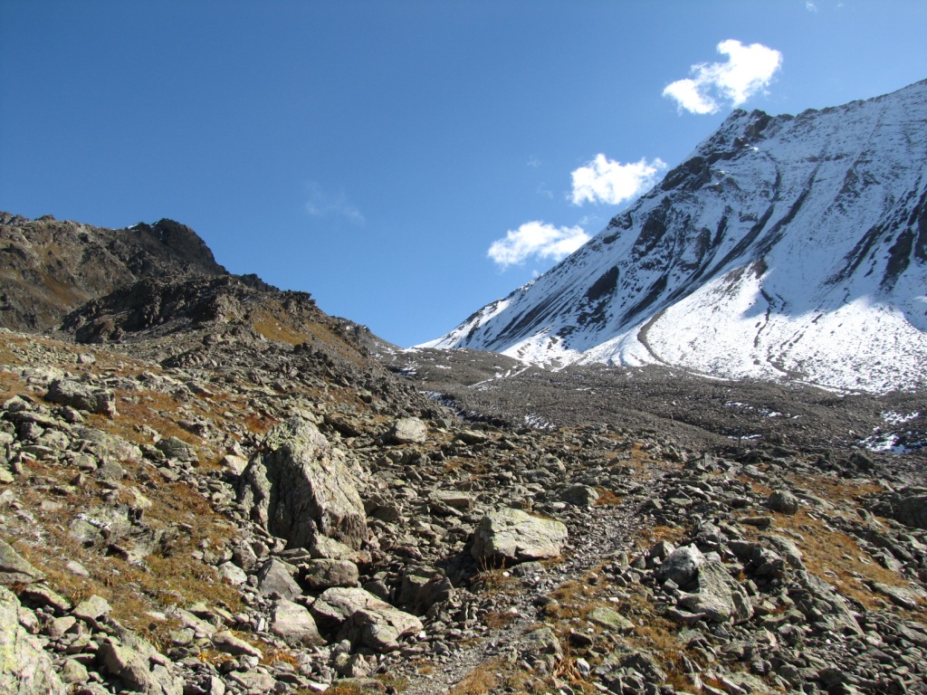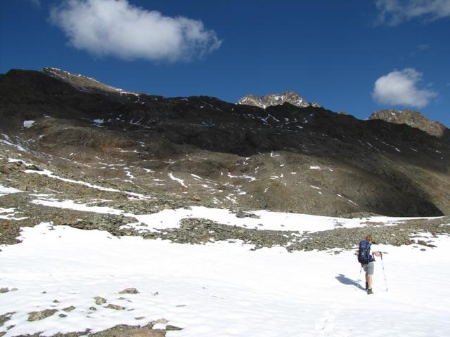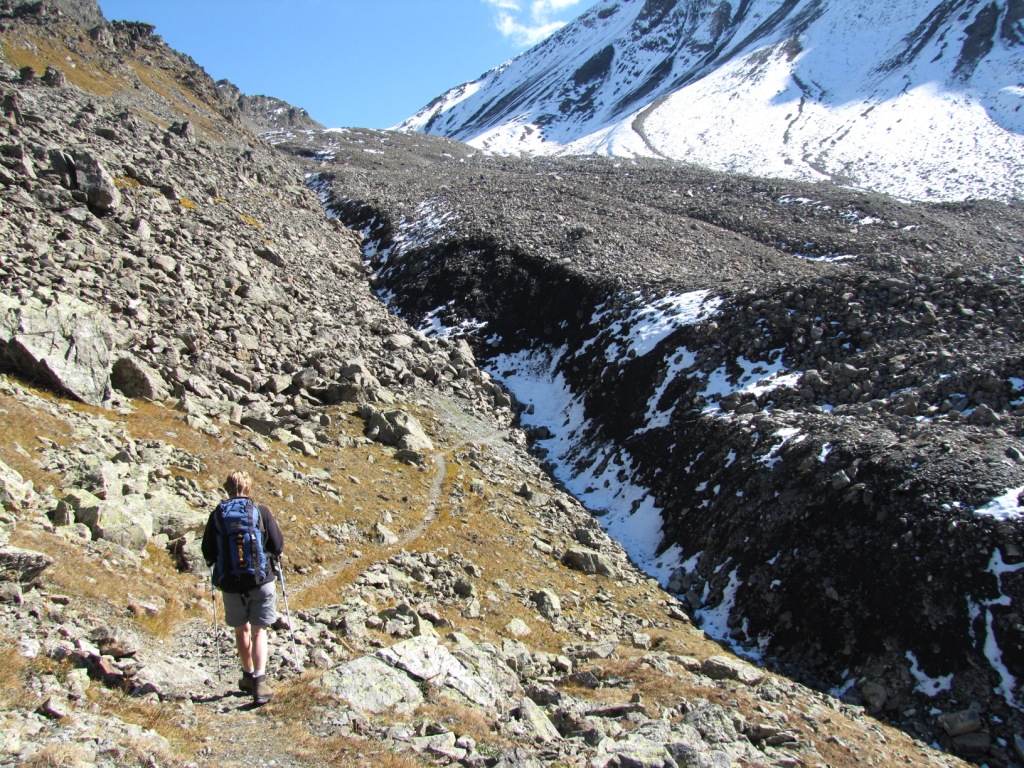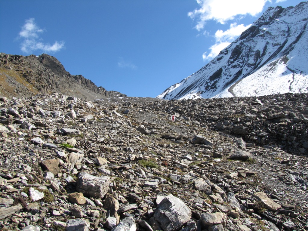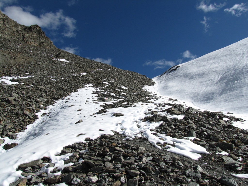 über Geröll und Schneefelder führt der Weg steil zur Fuorcla Pischa hinauf