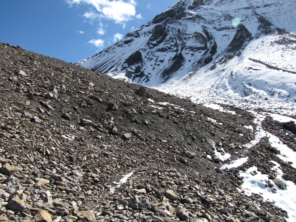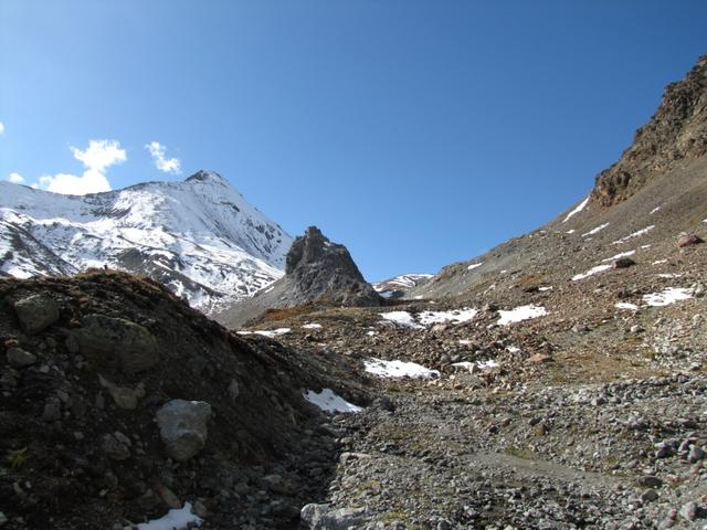 von hier aus wird es zum Teil weglos, da der Bergpfad nun über Geröll und Schutt verläuft