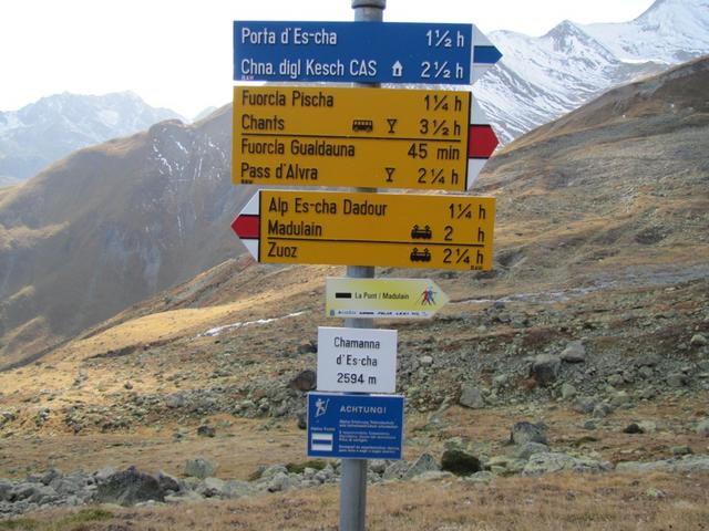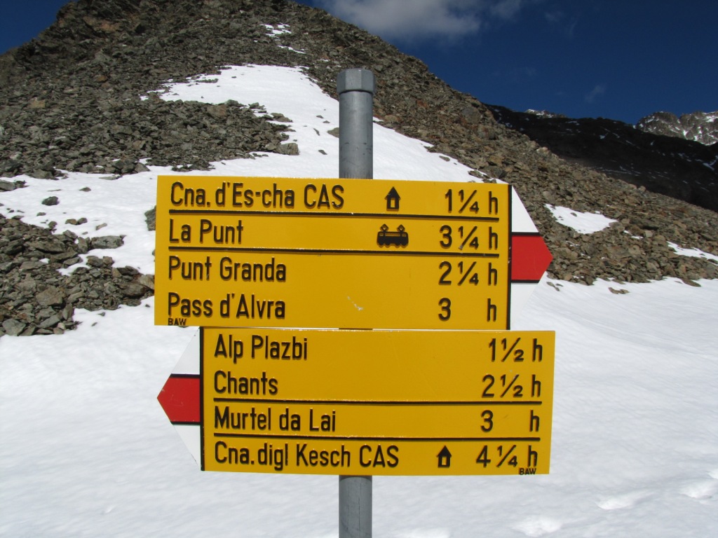 Wegweiser auf Alp digl Chants 1999 m.ü.M. unser nächstes Ziel die Fuorcla Pischa