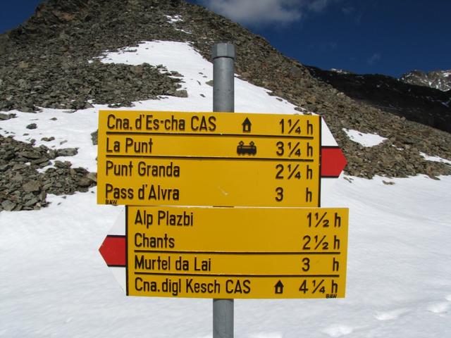 Wegweiser auf der Fuorcla Pischa. Unser Endziel für den heutigen Tag die Chammana d' Es-cha