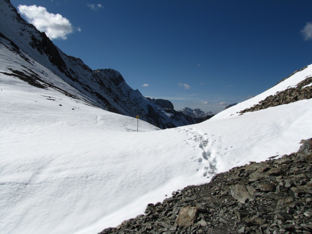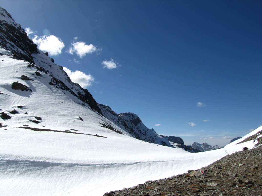 Blick zurück zur Fuorcla Pischa mit seiner Schneewächte