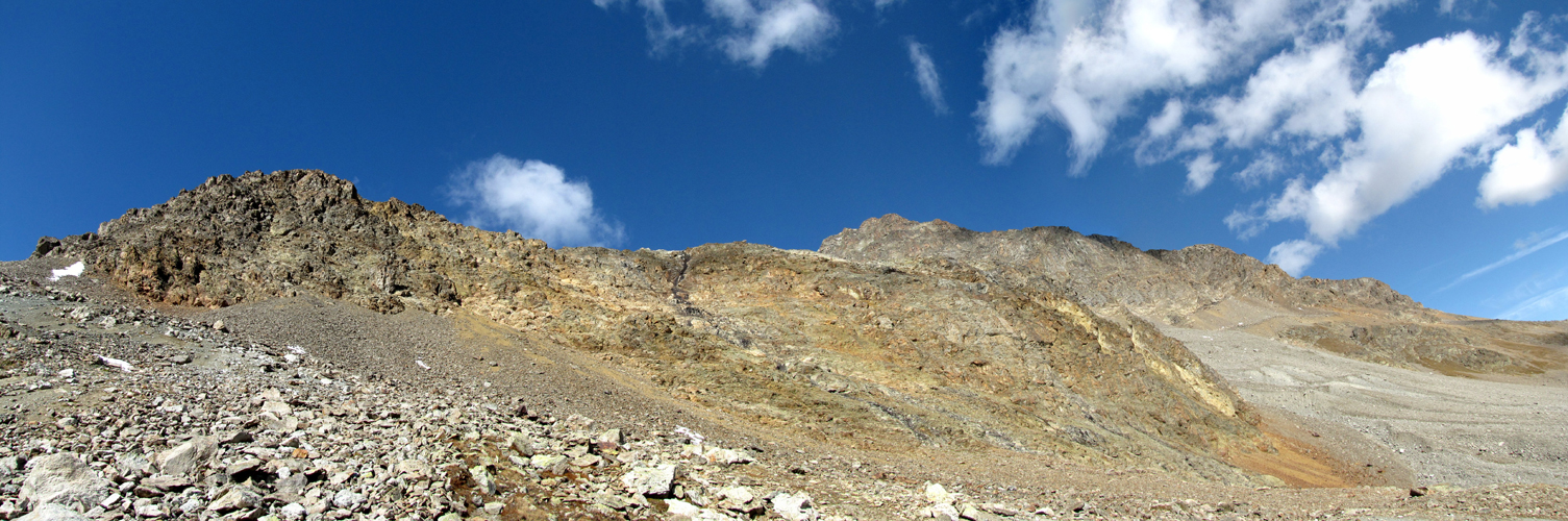 Breitbildfoto Piz Pischa und Piz Cotschen. Die Felswand weist diverse Gesteinsarten und Farben auf