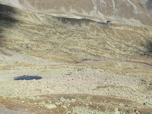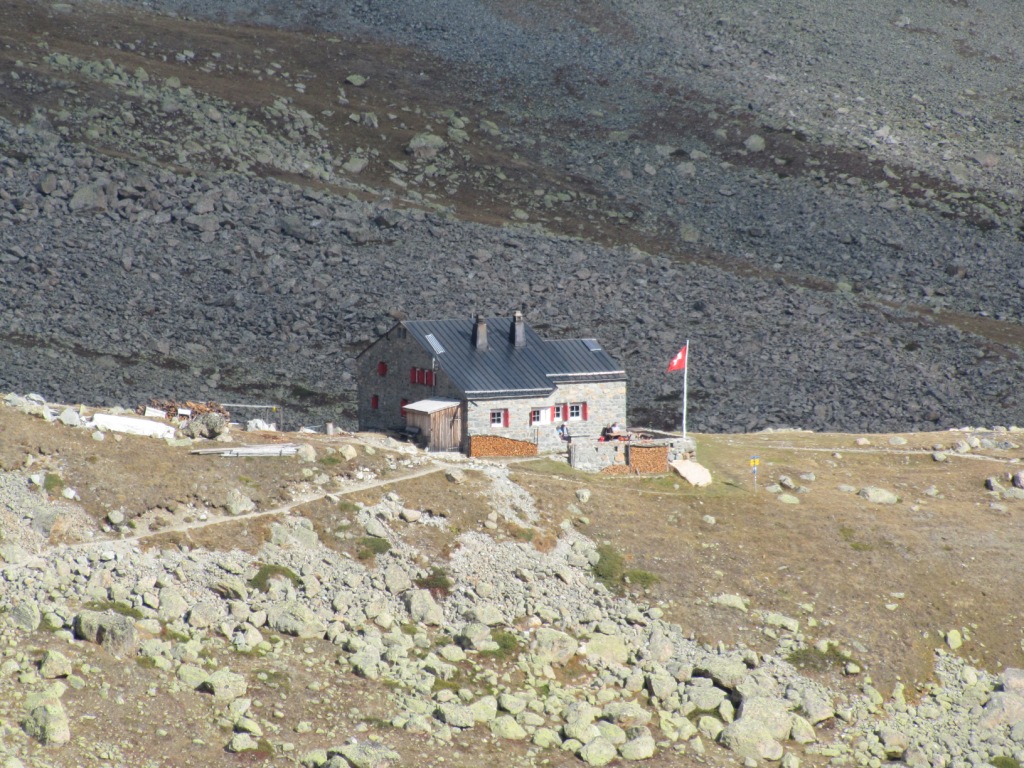 Blick zur Chamanna d'Es-cha das auf einem Moränenwall gebaut wurde. Oberhalb der Hütte die spartanische Dépendance