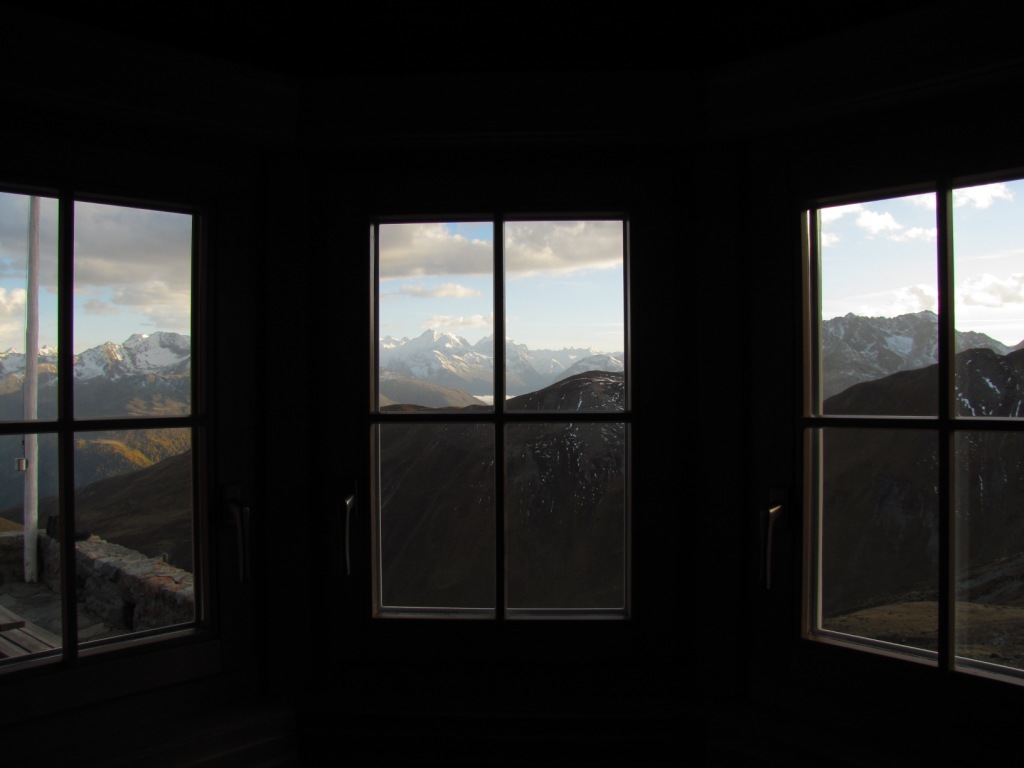Blick vom Erker hinaus zur Berninagruppe