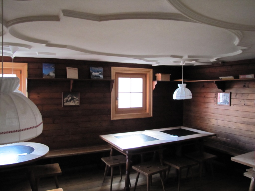 der Aufenthaltsraum der Chamanna d'Es-cha mit der berühmten Stukkaturdecke