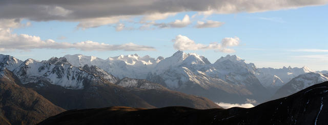 Breitbildfoto Oberengadiner Berge mit Piz Bernina, Piz Palü, Bellavista, Piz Roseg usw.