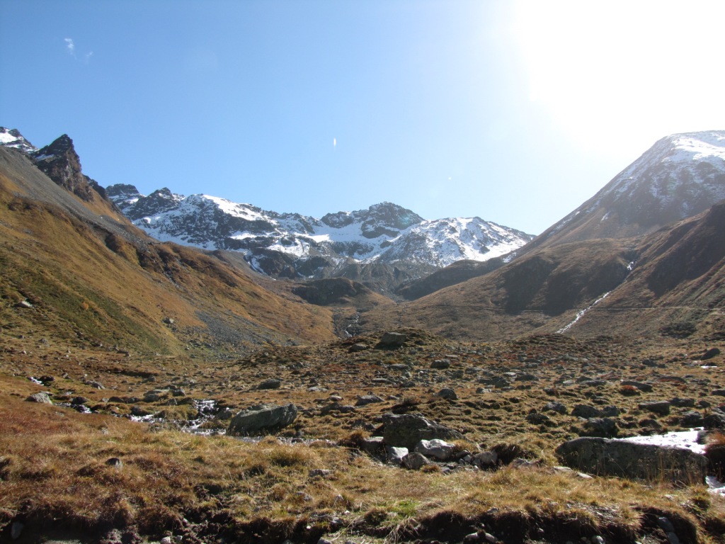 Blick vom Grüensee aus gesehen Richtung Sertigpass. Links der Chüealphorn und Passhöreli. Rechts versteckt der Sertigpass Datum 01.12.2010