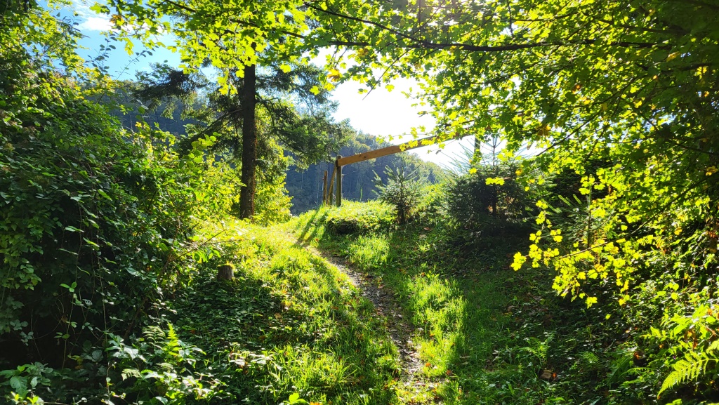 der Wanderweg führt uns nun steil durch den Wald abwärts Richtung Kobelwald Datum 21.12.2023