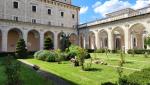 wir blicken auf den Kreuzgang von Bramante mit den Statuen von Benedetto und Scolastica