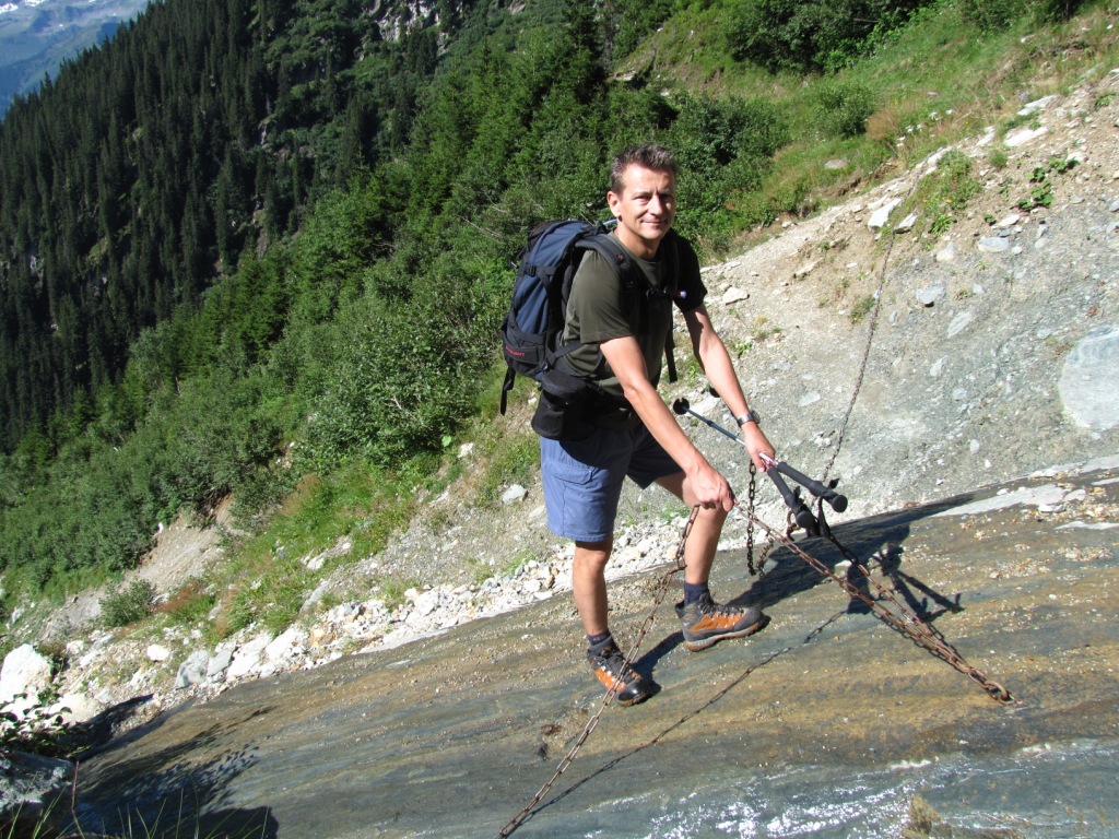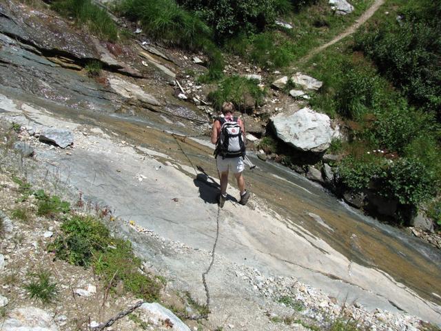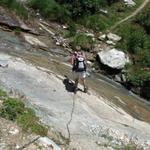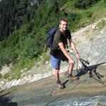 bei Uaul da Punteglias überquert Franco einen Bach. Ketten sind zur Sicherung vorhanden. Problemlos machbar Datum 07.09.2010