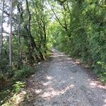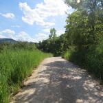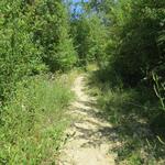 der Weg biegt von der breiten Kiesstrasse weg und wird zu einem schmalen Pfad