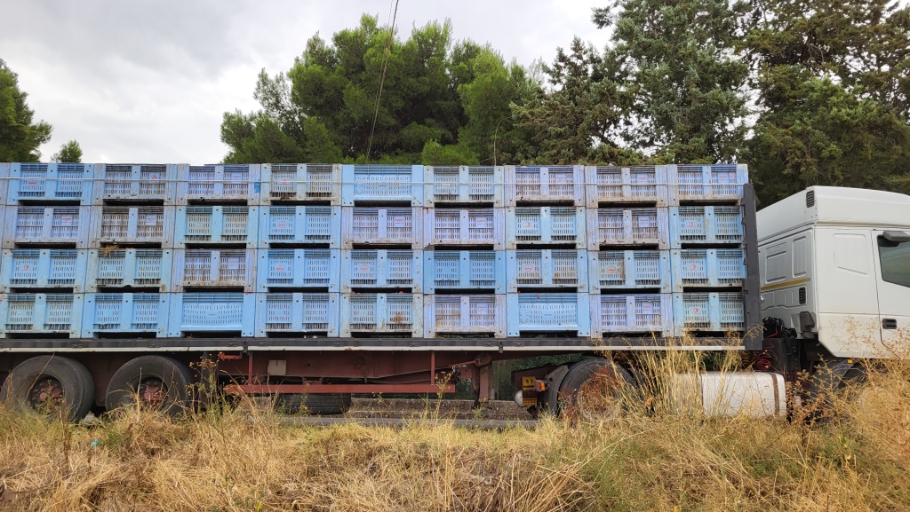 ...in riesige Lastwagen. Viele Tomaten bleiben am Boden. Wir haben ein paar aufgelesen und gegessen. Köstlich Datum 06.12.2023