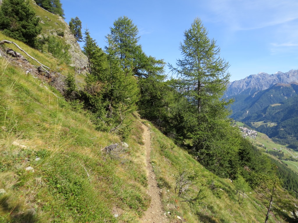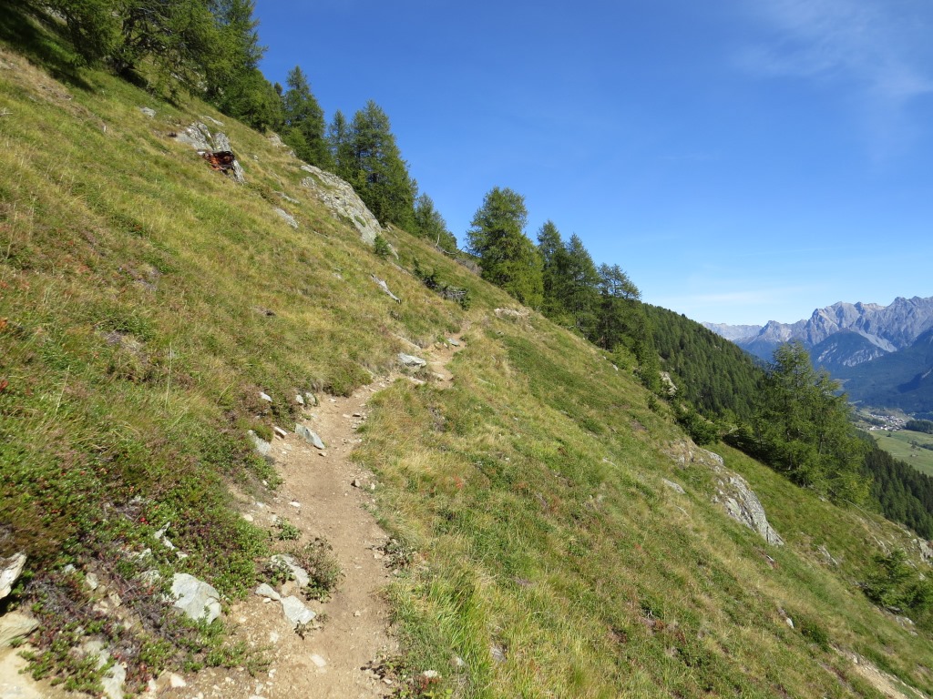 die Via Engiadina führt uns nach der Mittagspause durch die steile Südflanke des Muott' Auta