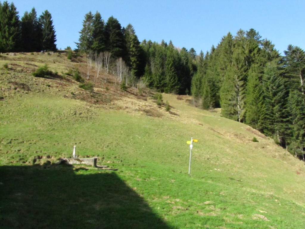 Wegweiser bei Punkt 949 m.ü.M. kurz vor Laufenweid. Es geht weiter Richung Wolzenalp