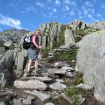 über griffigen Blockschutt führt der Bergweg abwärts. Datum 14.10.2011