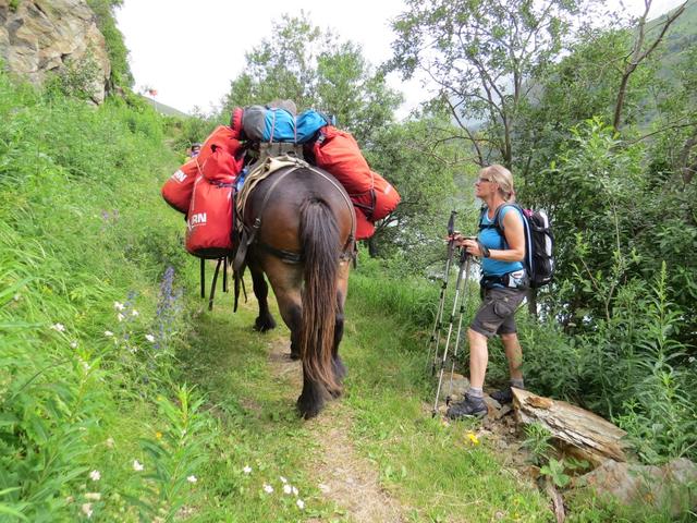 vor uns taucht eine Gruppe von Säumer auf, mit Packpferd