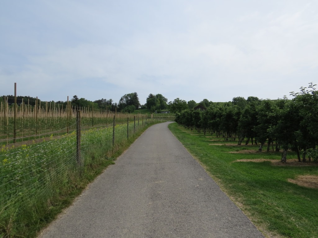 neben Obstbäumen geht es nun leicht aufwärts Richtung Oberreutin