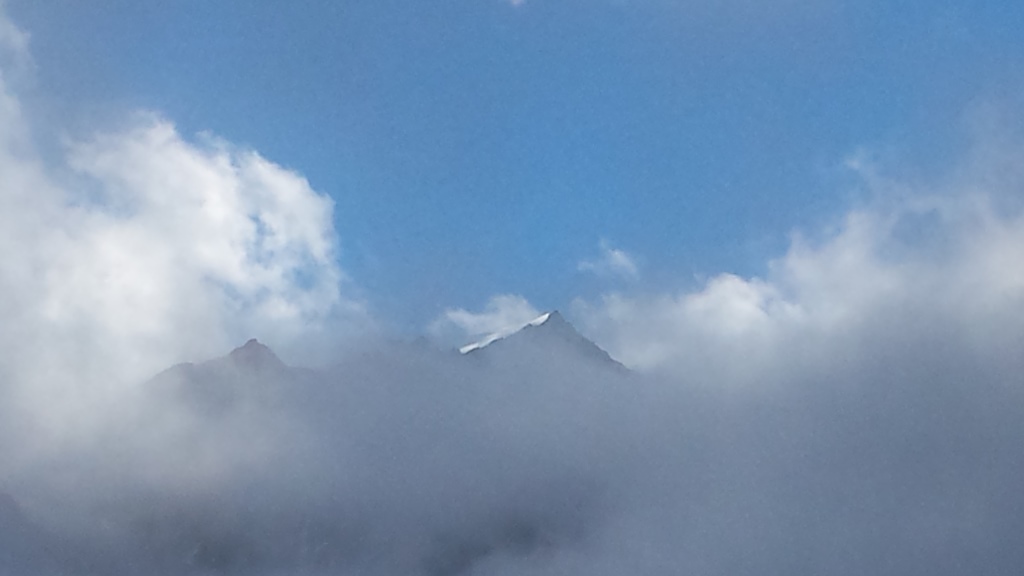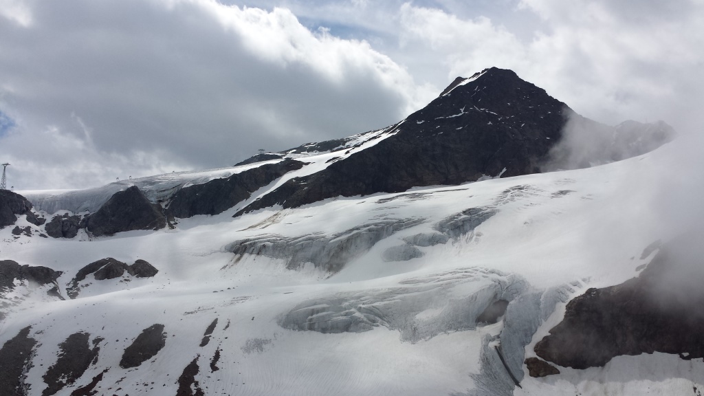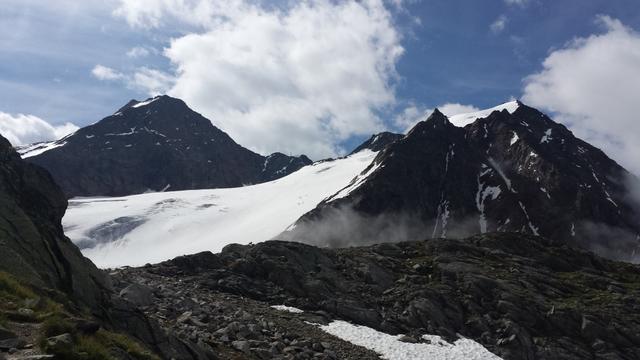 Blick hinauf zur Wildspitze die sich kurz hinter den Wolken zeigt Datum 02.08.2016