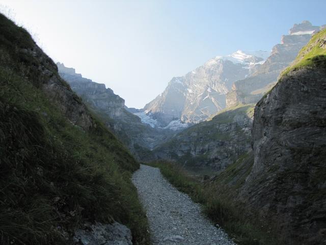 an der linken Talseite führt der Bergpfad aufwärts zur Gspaltenhornhütte