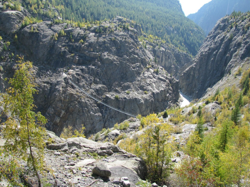 Tiefblick auf die Hängebrücke die über die Massaschlucht, Belalp mit Riederalp verbindet Datum 18.01.2012