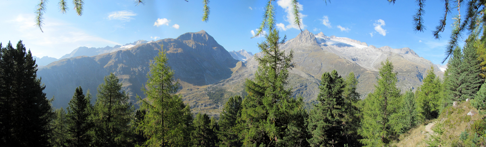 Breitbildfoto beim Hotel Belalp. Am Horizont Fletschhorn, die Mischabelgruppe, das Matterhorn und das Weisshorn Datum 07.02.2017