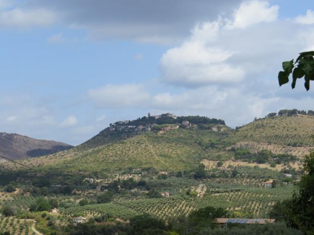 wir blicken zurück auf das auf einen Hügel liegende Fara