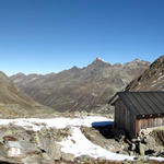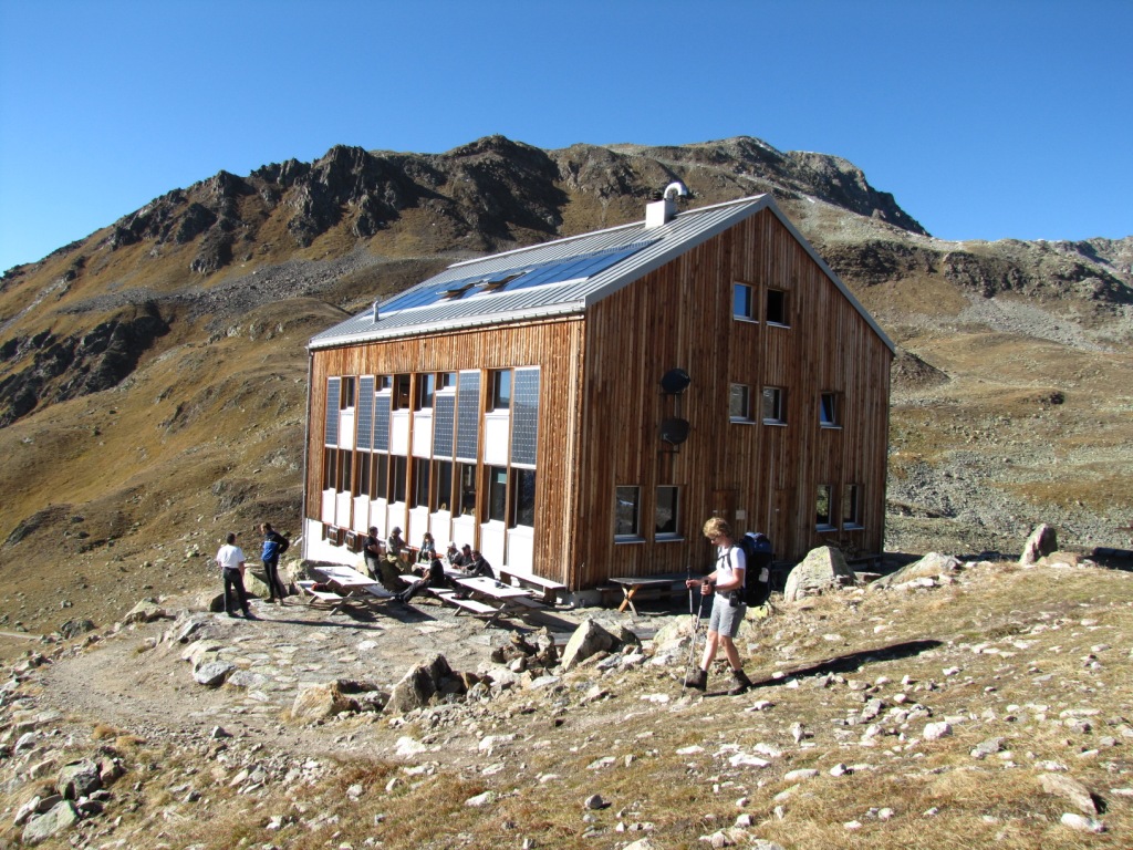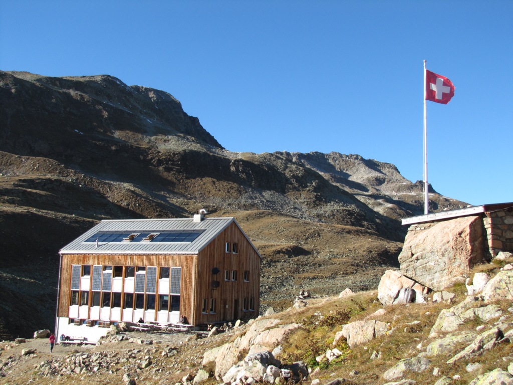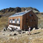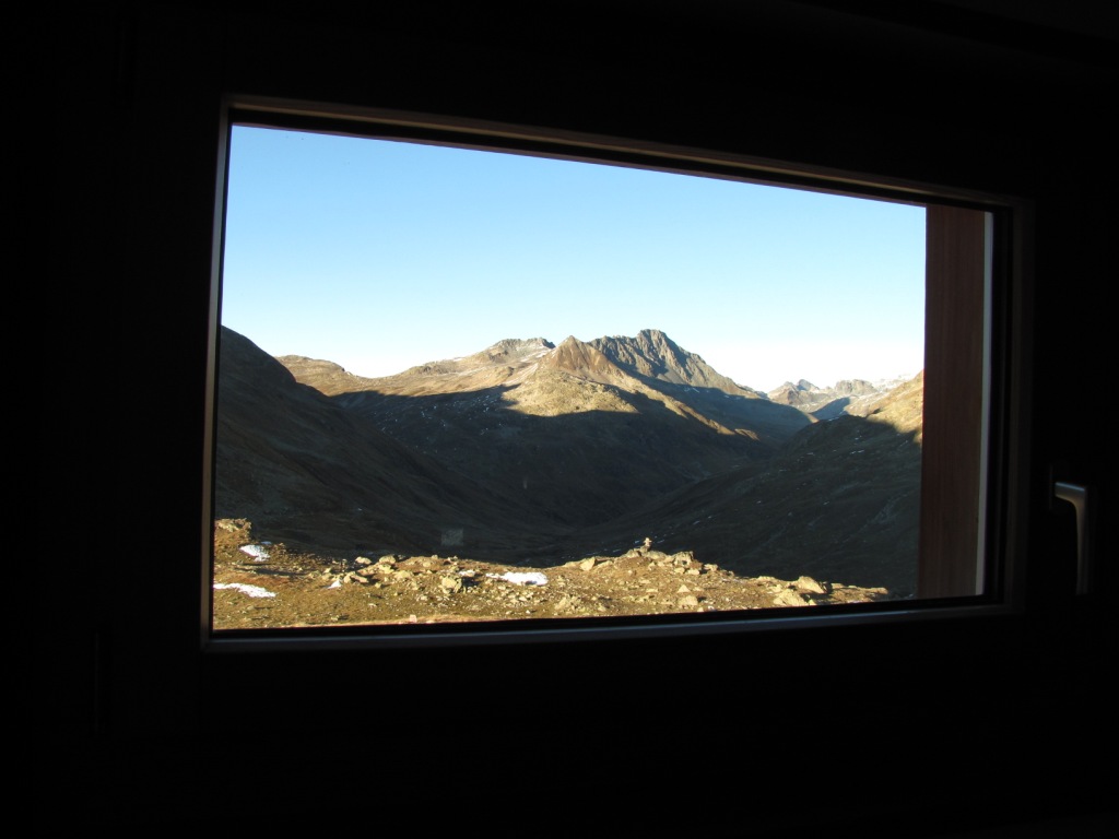 Breitbildfoto vom Aufenthaltsraum der Chamanna digl Kesch aus gesehen, Richtung Piz Kesch