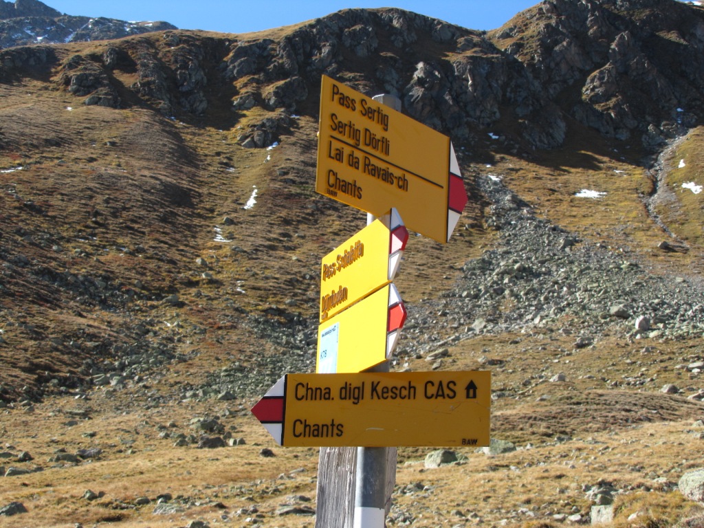 Wegweiser bei Punkt 2453 m.ü.M. nach rechts führt der Weg zum Sertigpass