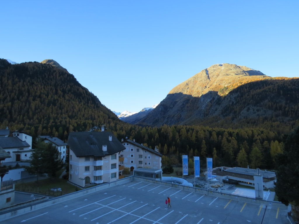 auf der anderen Talseite begrüssen uns Piz Murtèl und rechts davon die Bergstation der Corvatsch Seilbahn