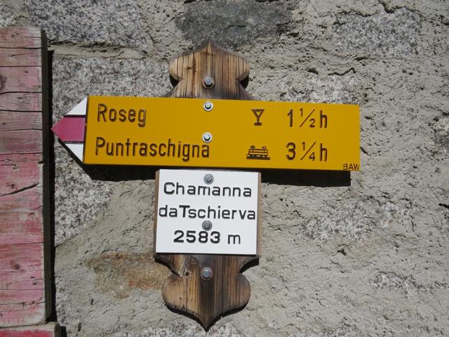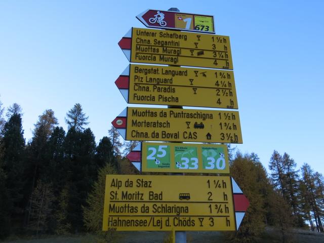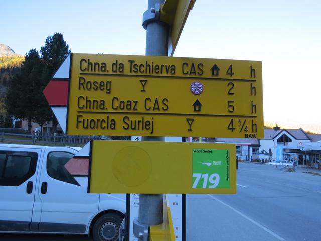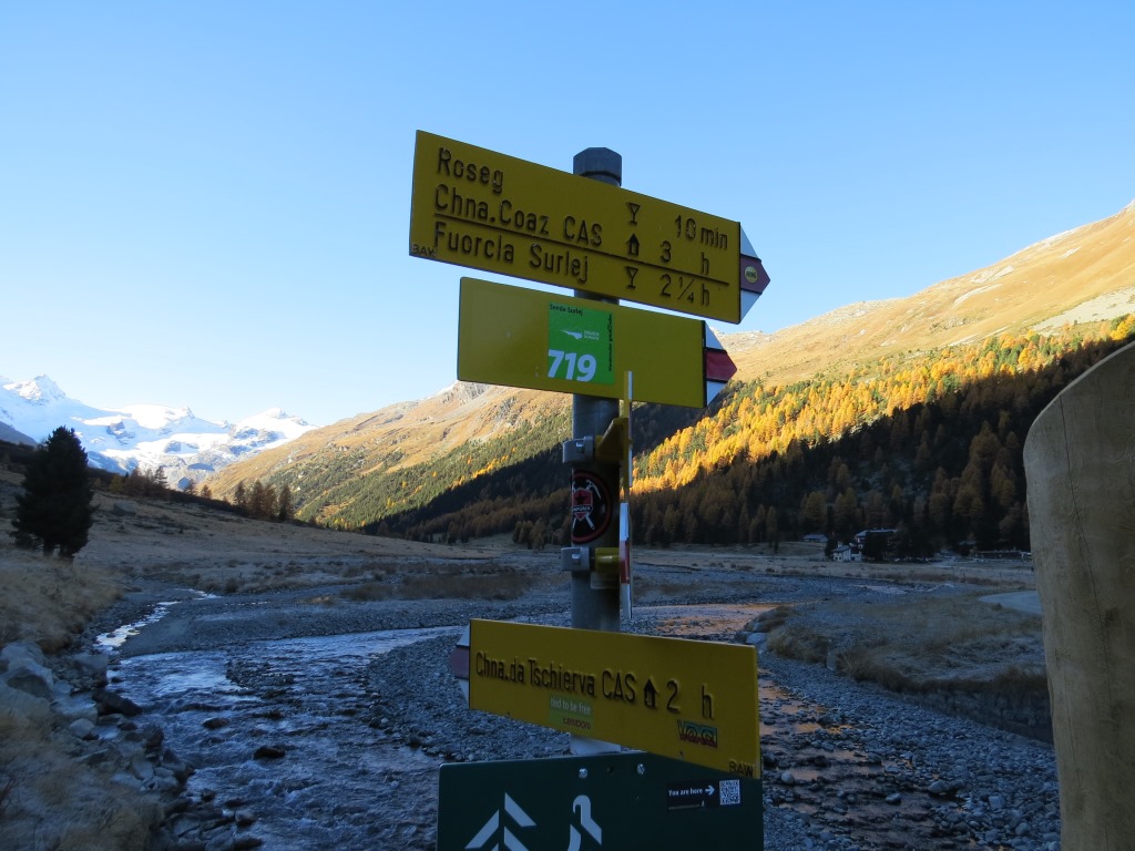 Wegweiser beim Parkplatz von Punt Ota, Eingangs Val Roseg