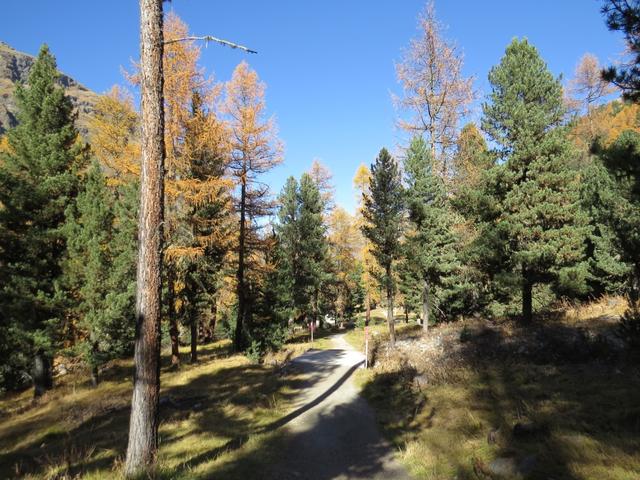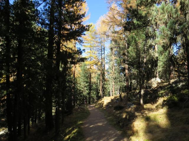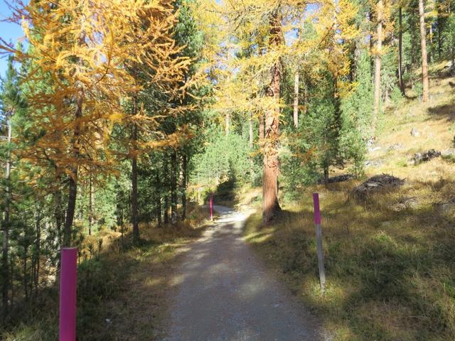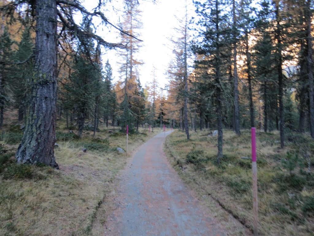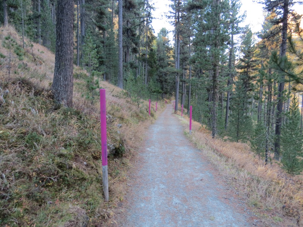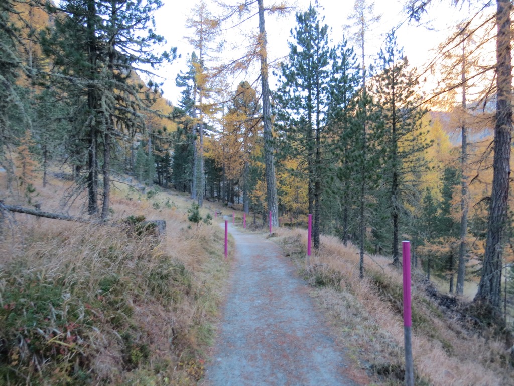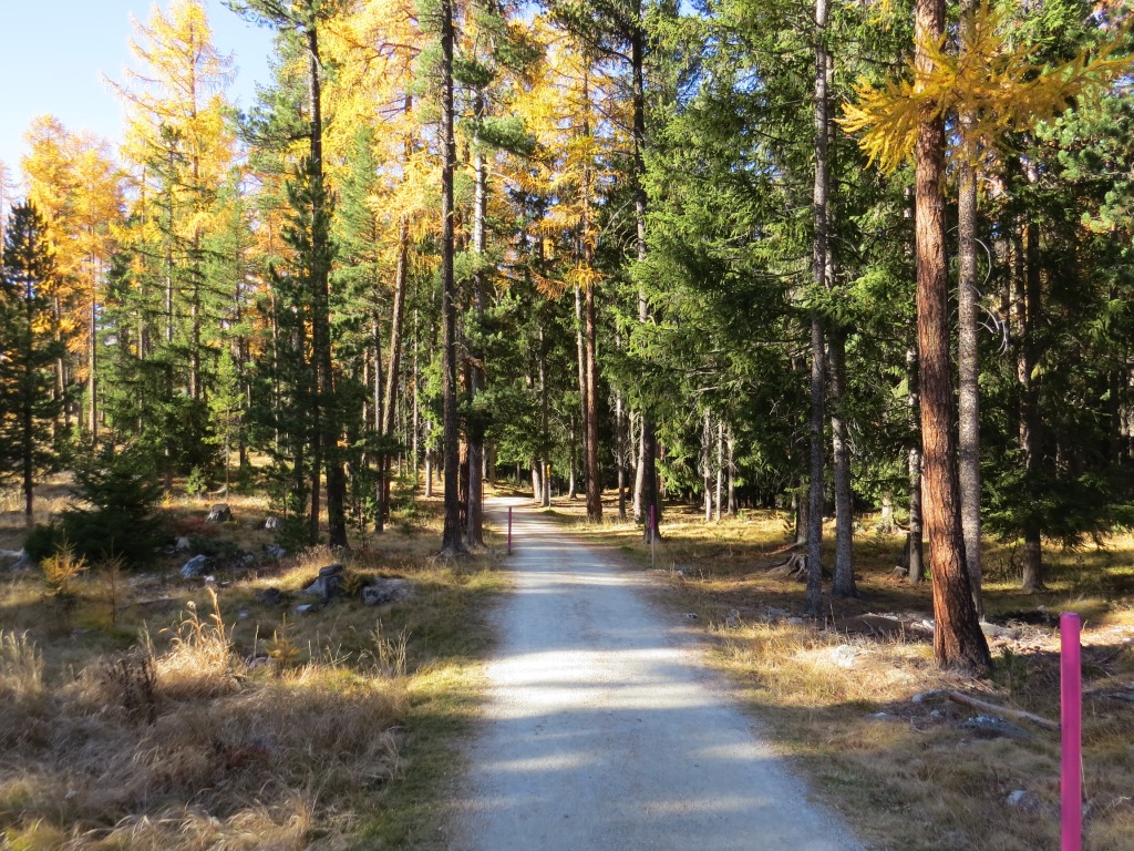 der breite Wanderweg führt uns bequem, leicht ansteigend durch den Arven-Lärchen Mischwald unterhalb des Muottas Puntraschigna