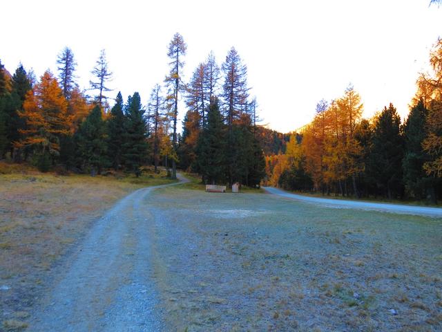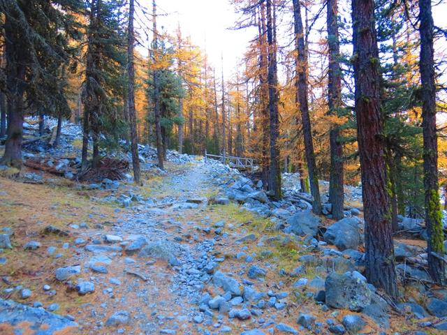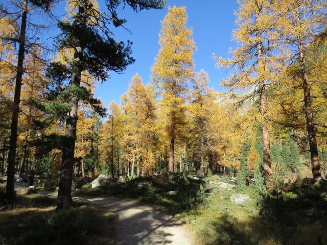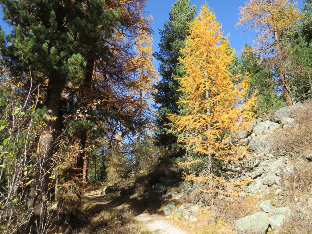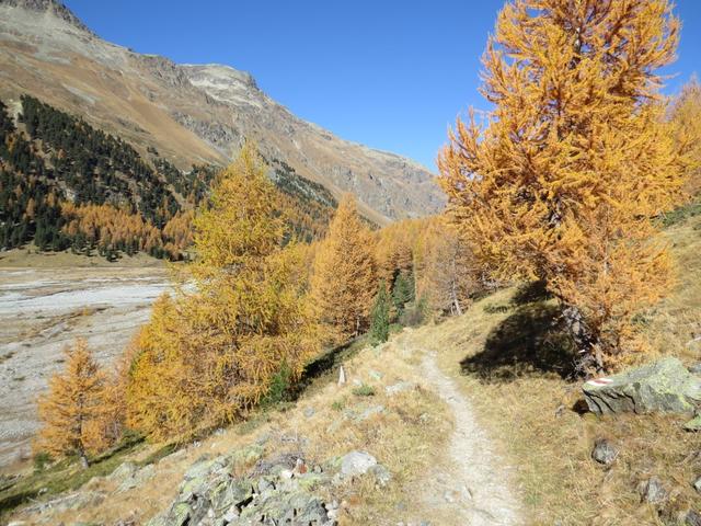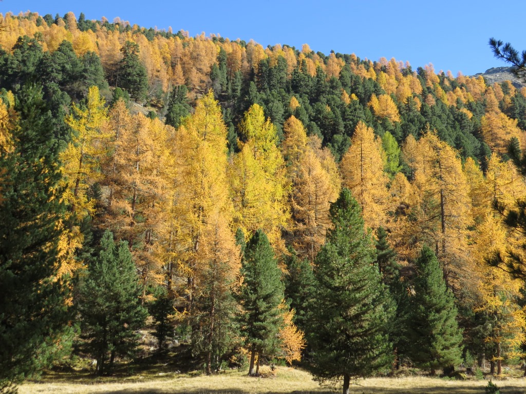 geradeaus weiter, durchwandern wir Orange-Gold leuchtende Lärchenwälder