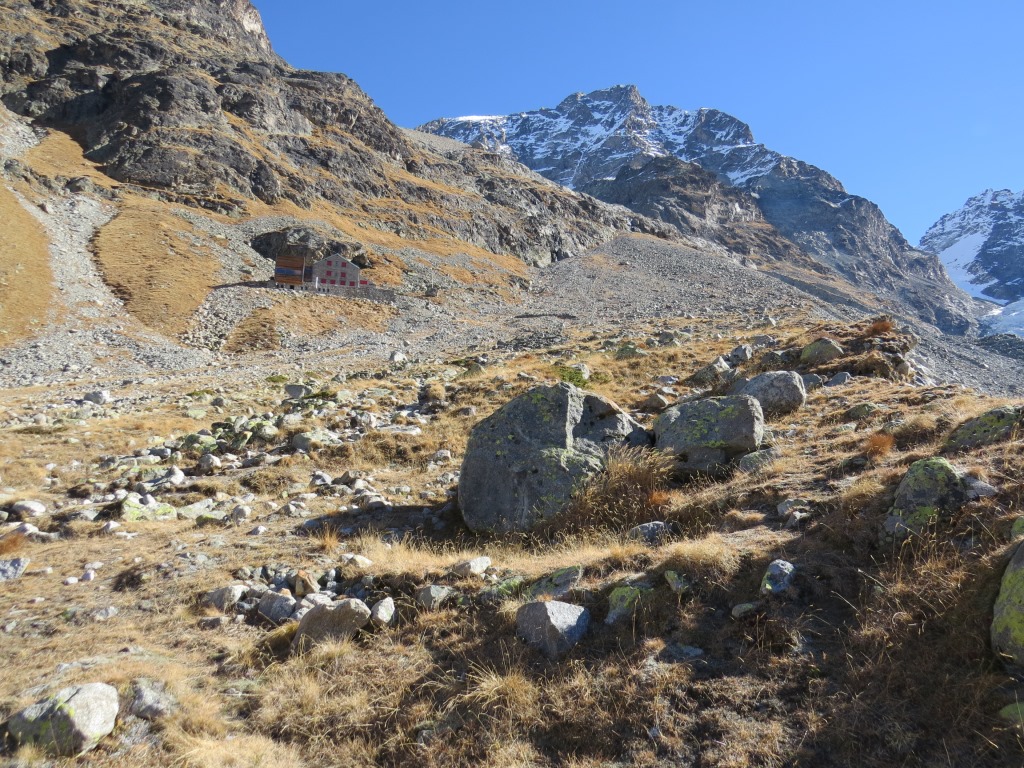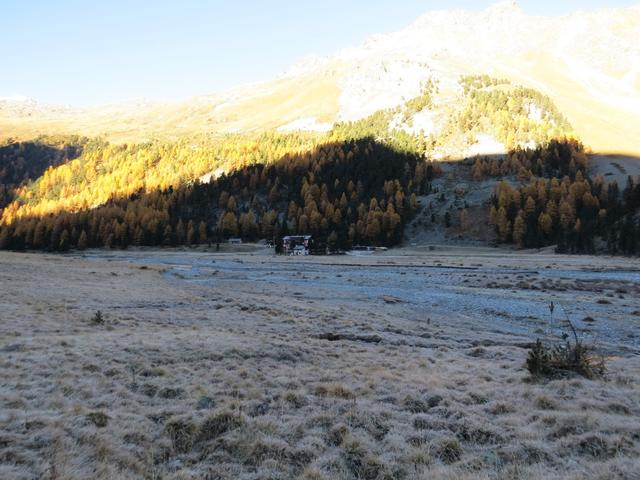 mit dem Fernglas erkennen wir im Talschluss, die Chamanna Coaz. Diese Hütte haben wir am Vortag besucht. Prädikat traumhaft