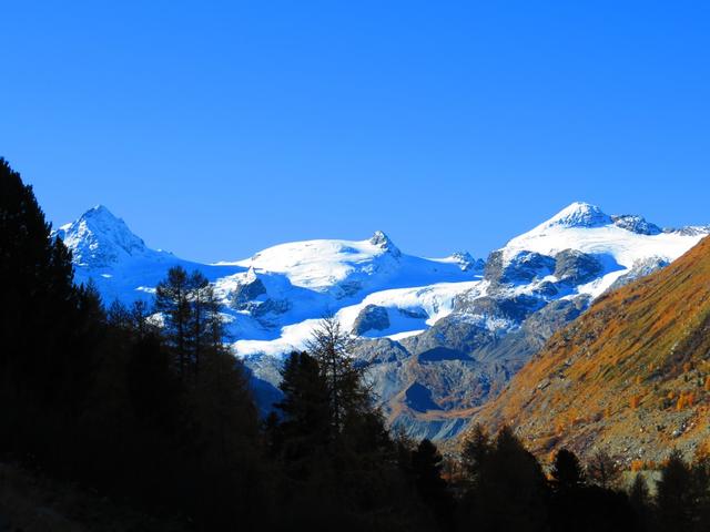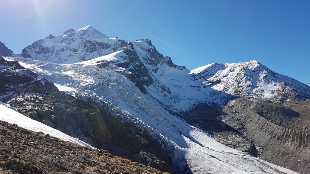wir sind umgeben von mächtigen Bergen der Bernina-Gruppe, die ringsum in den Himmel ragen